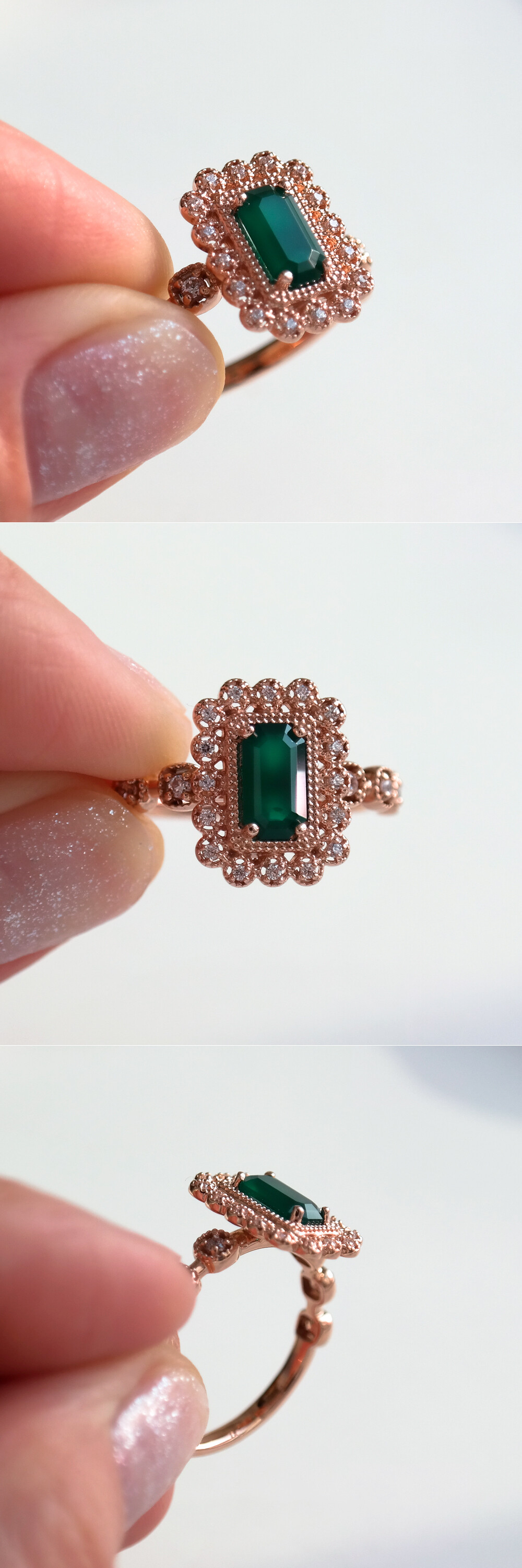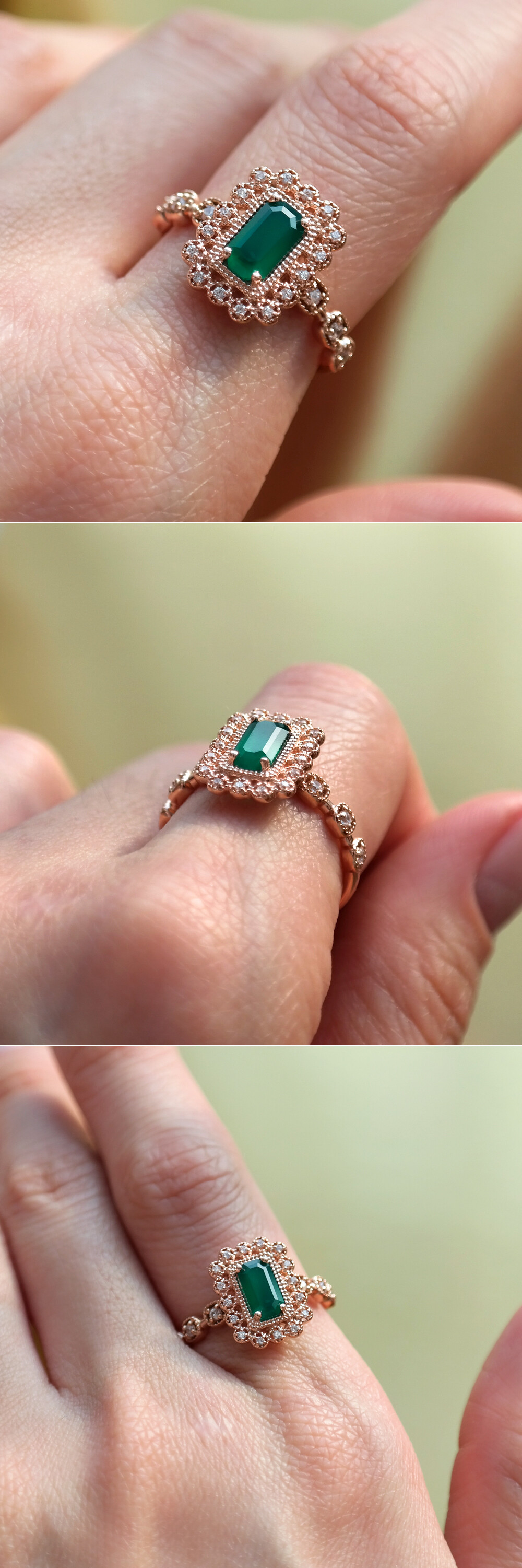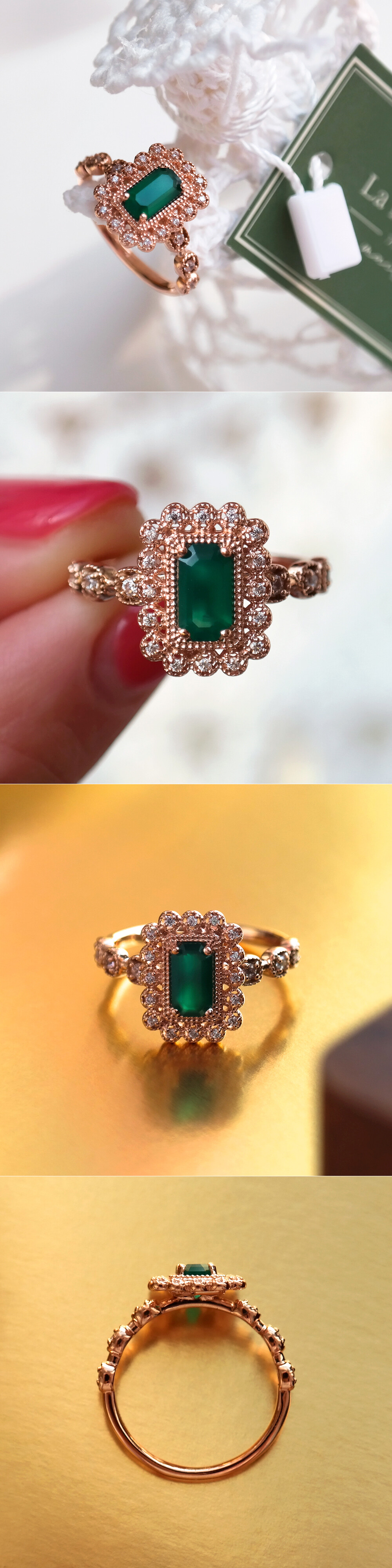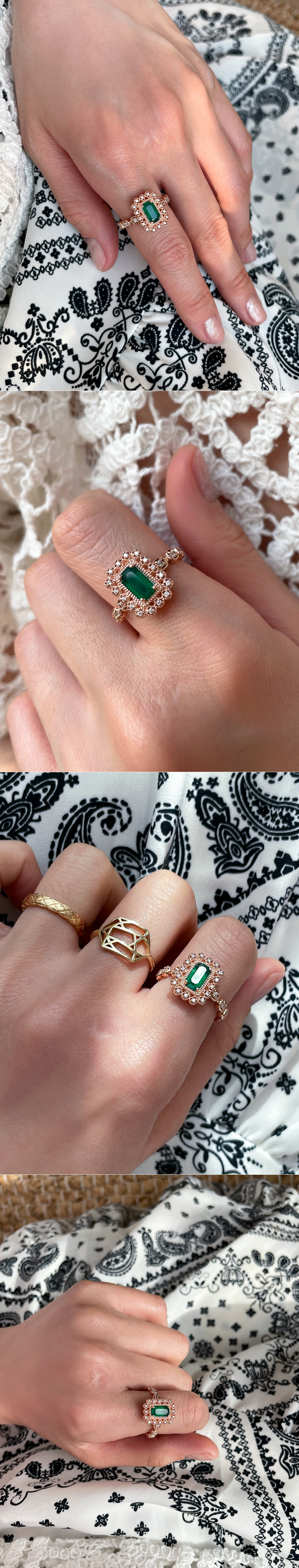 아르누보 에메랄드컷 그린 오닉스 & 큐빅 반지