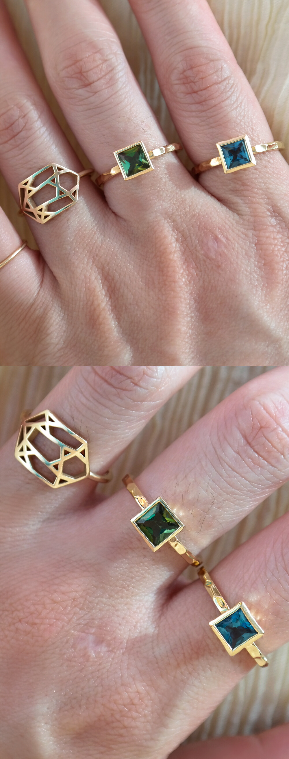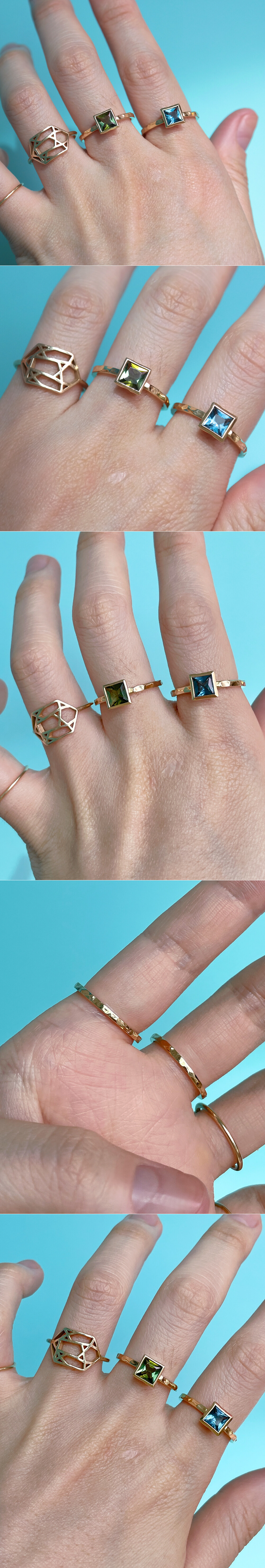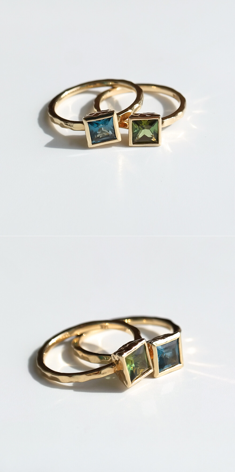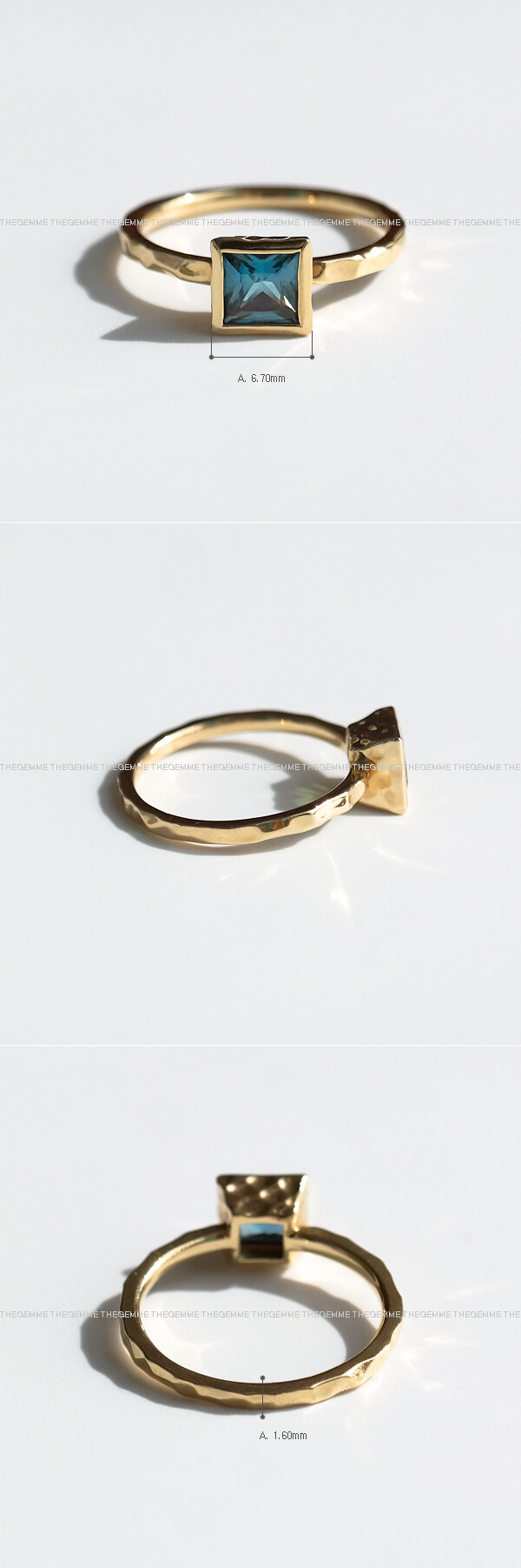 엣지있고 세련된 스퀘어컷 원석이 세팅된 반지입니다. 💍 현재 촬영된 이미지의 반지에는, 딥블루 컬러의 토파즈(런던블루)와 그린 컬러의 투어말린(전기석)이 세팅되었구요, 이 외에도 다양한 종류의 원석을 직접 선택하셔서 세팅하실 수 있도록 컬러별로 여러 가지 스톤들을 준비해서 올려보았어요. (* 종류는 하단의 상세 설명에서 자세히 확인해 주세요.) 스톤의 사이즈는 약 5X5 사이즈의 스퀘어컷 쉐입이구요, 고 높이에 따라서 대략 0.5~0.6CT 캐럿 중량의 스톤이 세팅됩니다. 🩷 알 사이즈도 적당하고, 군더더기 없이 깔끔한 베즐 세팅과 해머링 기법으로 마무리된 심플한 라인의 반지라 데일리 반지로 착용하시기에도 아주 좋을듯싶어요. 다만, 디자인 자체가 스톤의 사방을 감싸고 있는 베즐 세팅이기 때문에 ; 이미지와 같이 세팅 후에는 스톤이 가진 본연의 색보다 조금 더 짙어 보일 수는 있습니다. 또, 주문 시마다 선택되는 스톤의 색상과 & 선택해 주시는 골드 색상에 따라 전반적인 색이 약간씩 달라 보일 수는 있으니 이 부분 꼭 참고해 주세요. 젊은 감각의 디자인과 세련된 분위기를 가진 원석 반지! 나만의 의미가 담긴 특별하고 소중한 포인트 반지 또는 데일리 반지로 추천해 드릴게요. ❤️