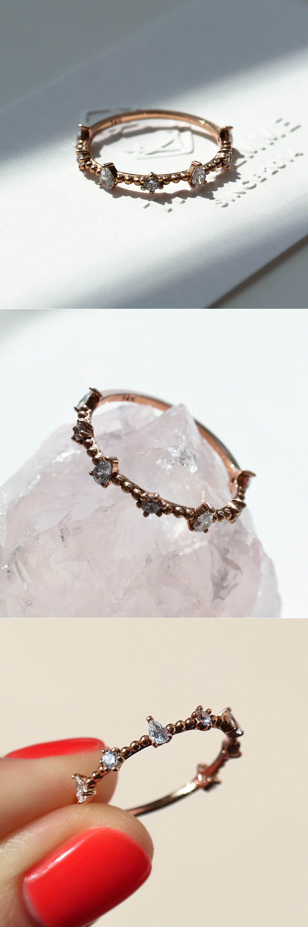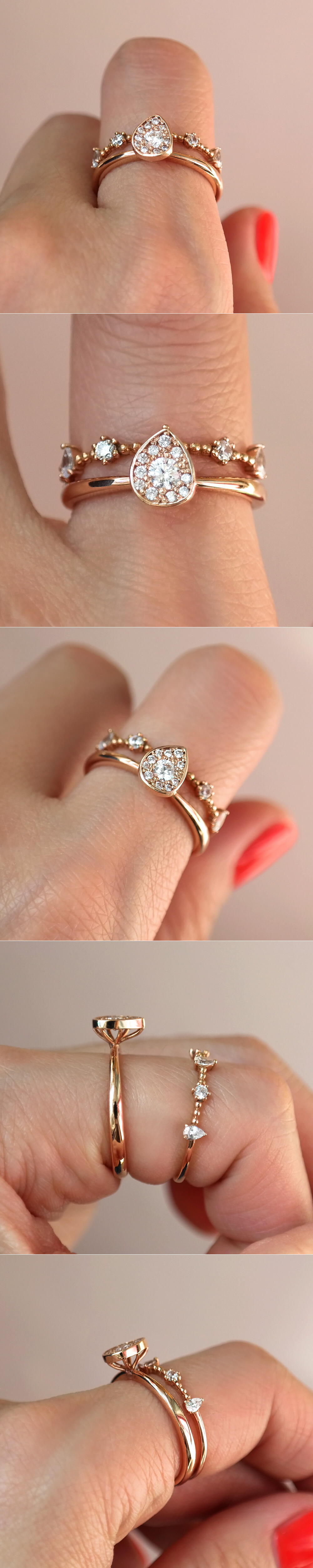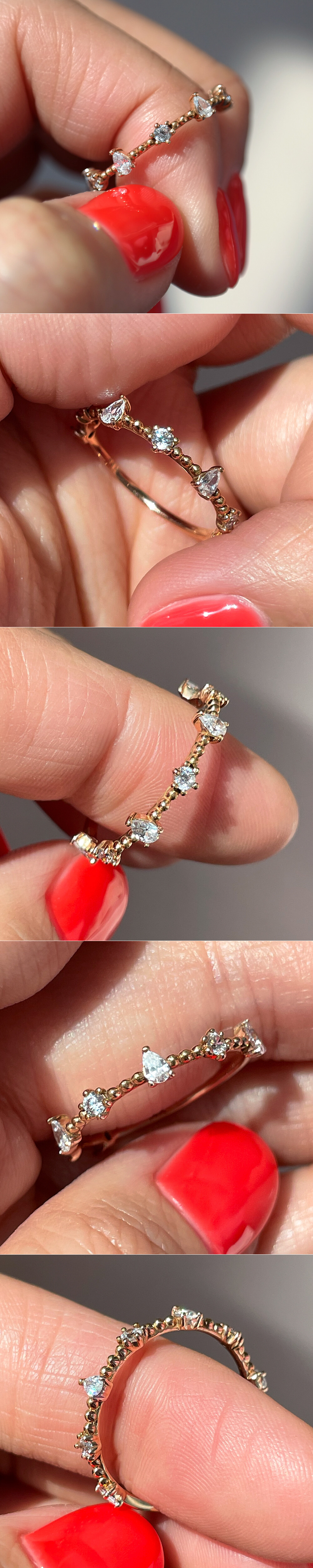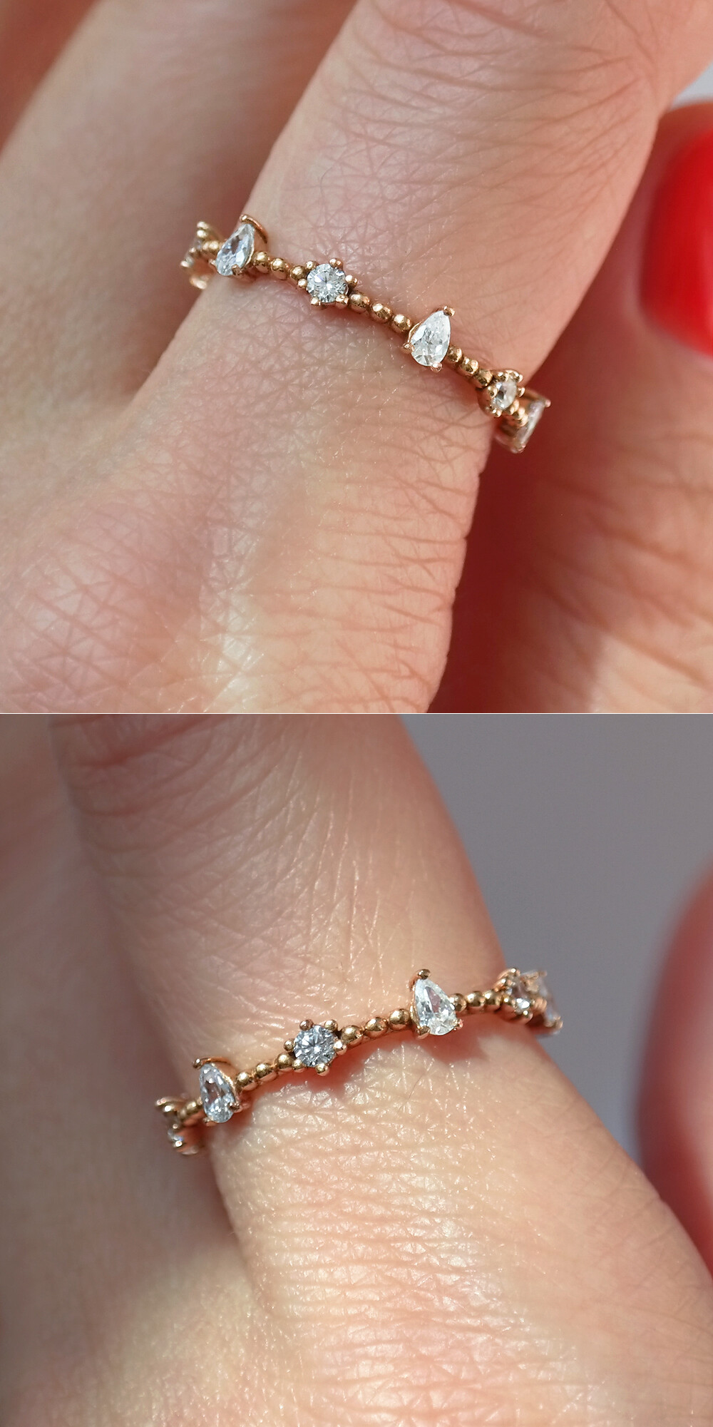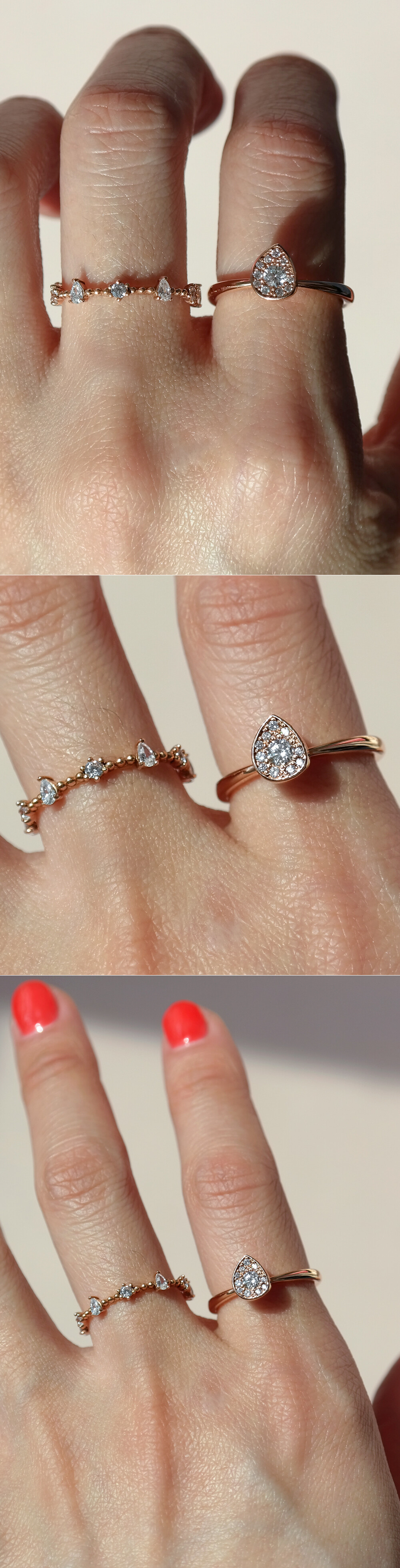 세련된 큐빅 장식의 반지입니다. 페어컷 큐빅과 라운드 큐빅이 여리여리한 방사형 느낌으로 연결된 디자인이에요. 원 포인트 반지로 착용하시기에도 좋고, 가드링으로도 활용도가 아주 높습니다.❤️