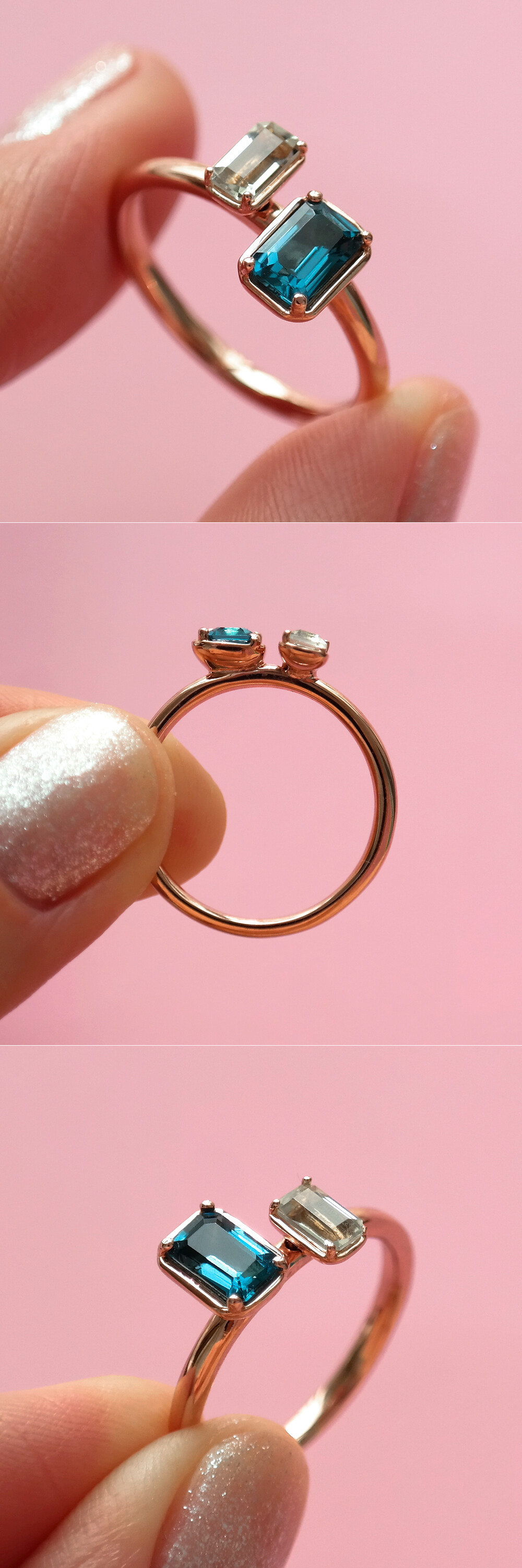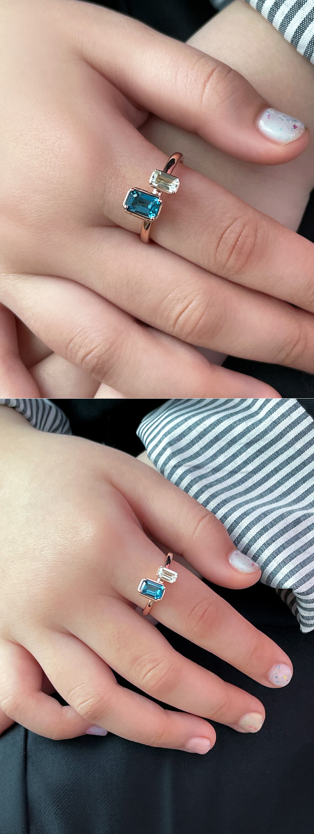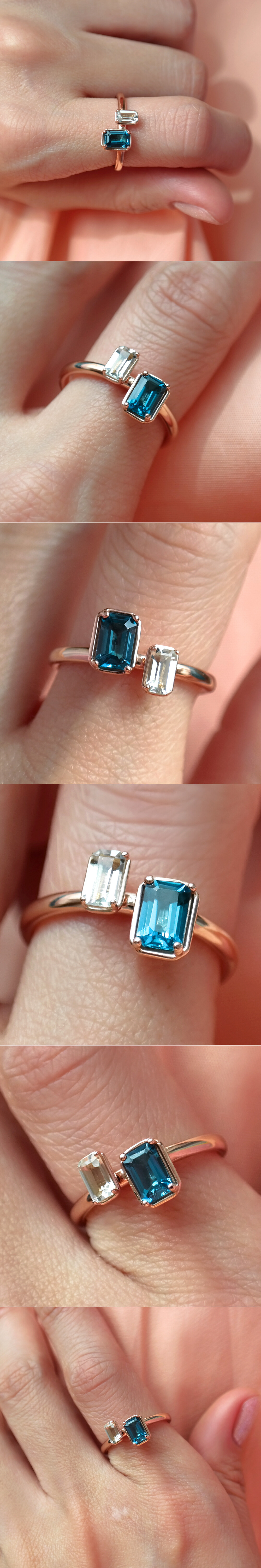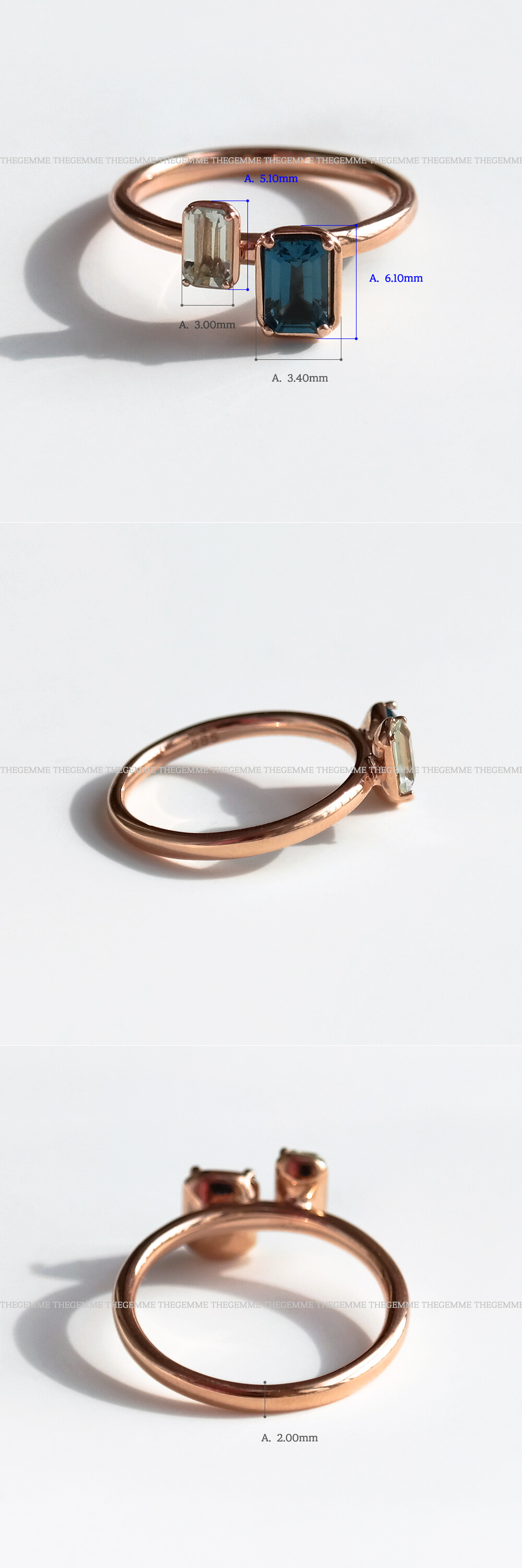 에메랄드컷 런던블루 토파즈 & 그린 쿼츠 반지