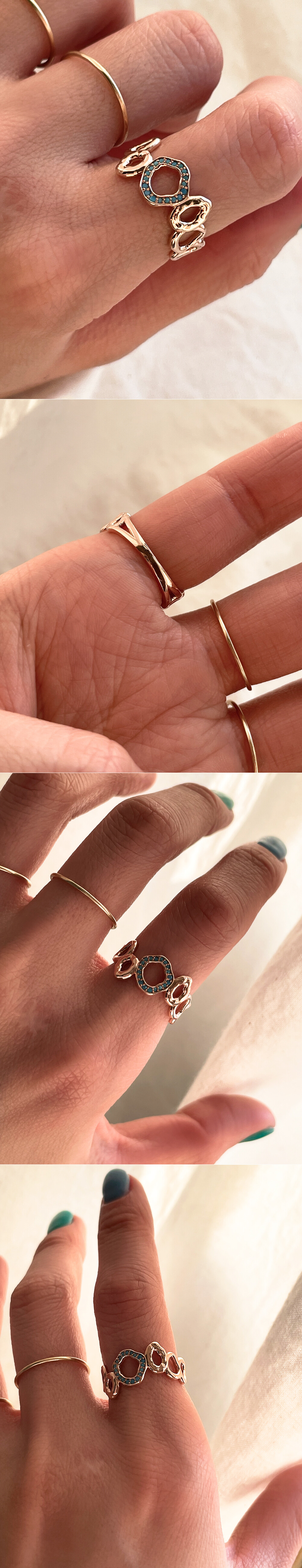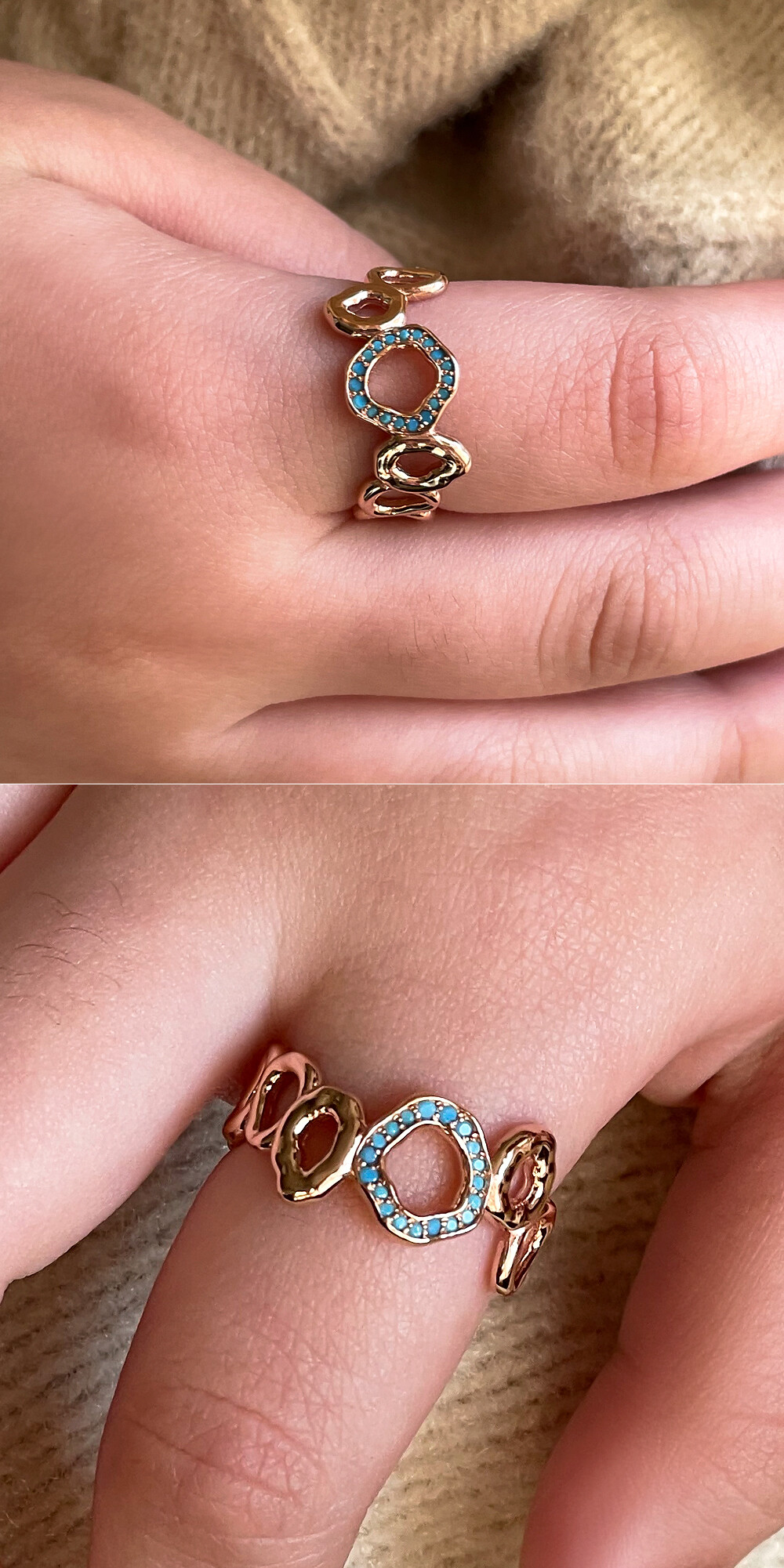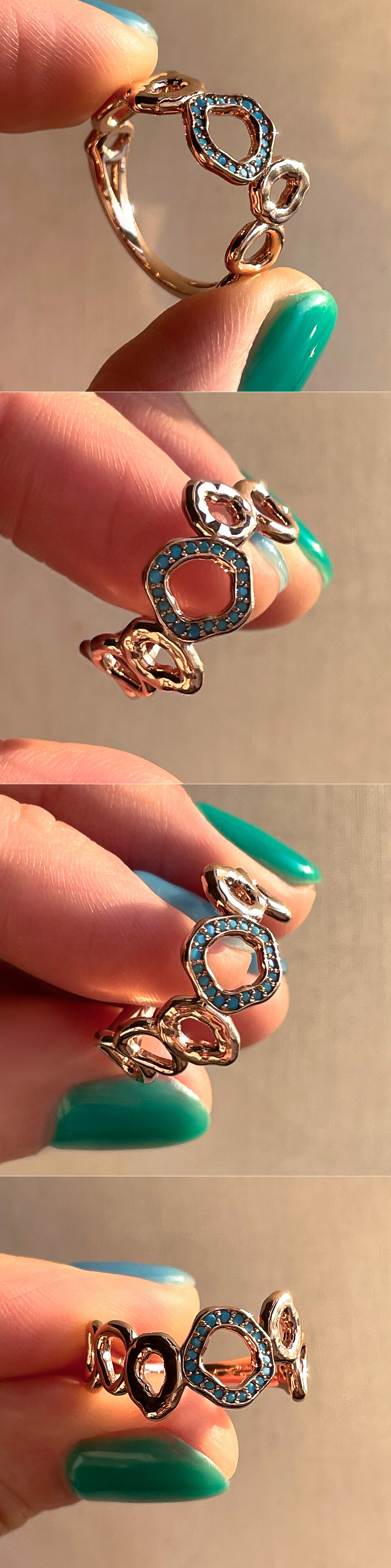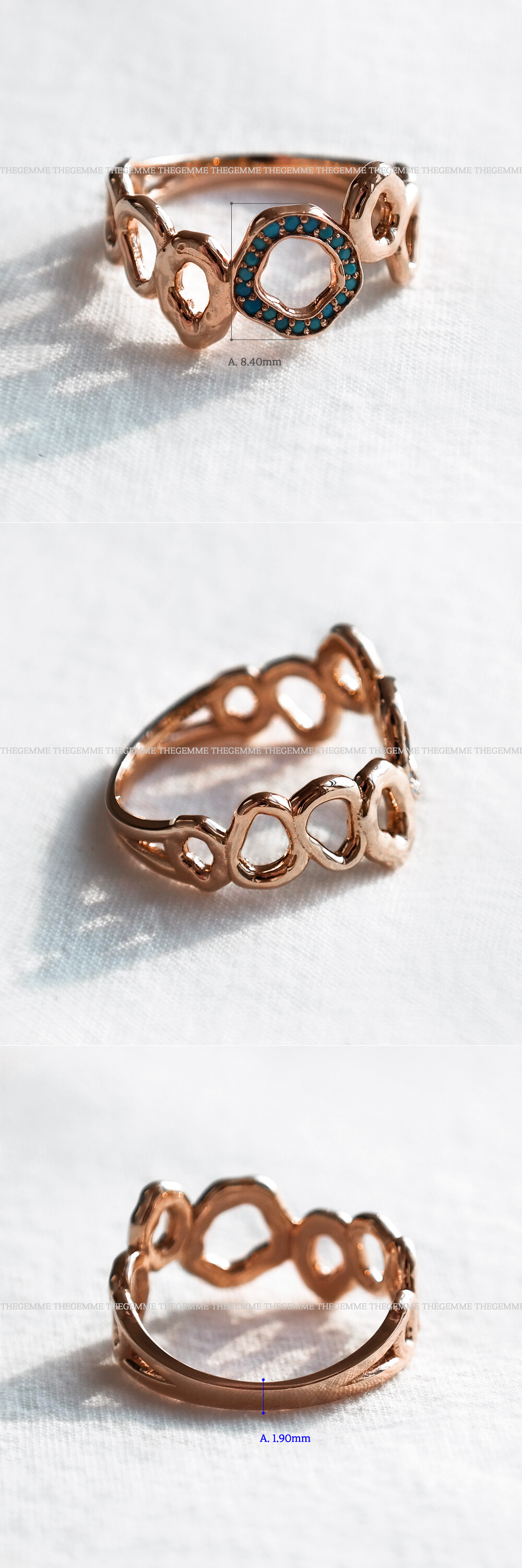 터키석 색상의 큐빅이 세팅된 반지입니다. 구불구불한 느낌의 원형 디자인으로 핸드메이드 느낌이 물씬 풍기는 디자인이에요. 원하시는 경우 추가 옵션에서 기본 화이트 큐빅으로 변경 가능하시니 참고해 주시구요, 자연스러운 곡선의 느낌을 좋아하시는 분들께 데일리 및 포인트 반지로 추천해 드릴게요. 💍💙