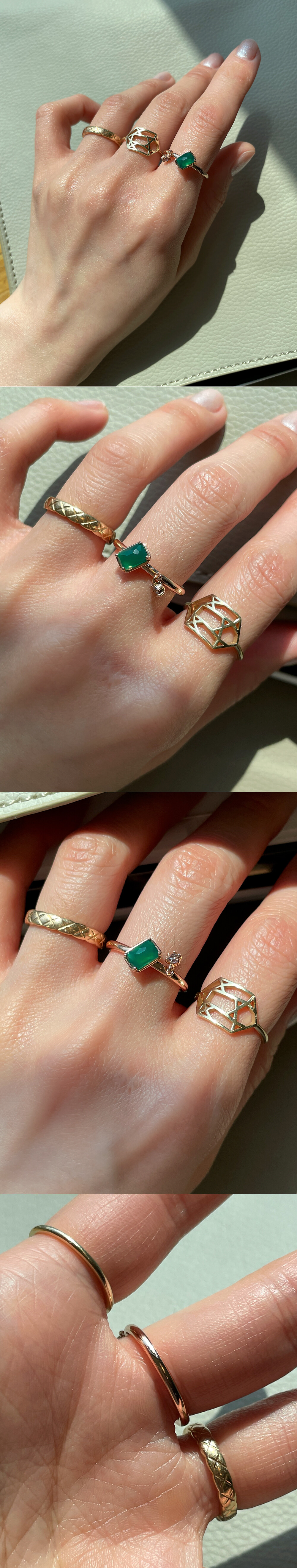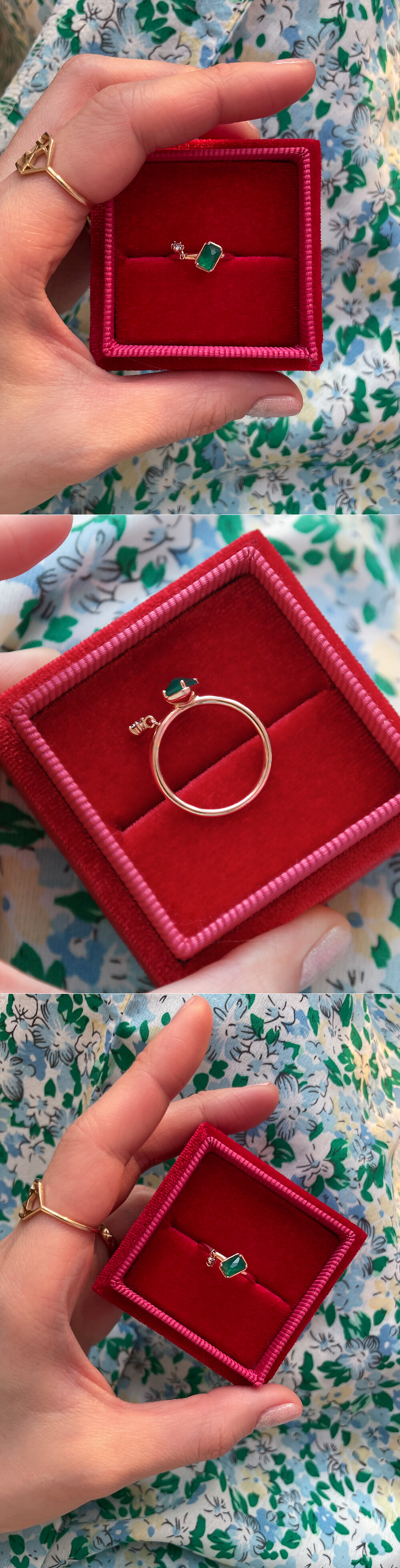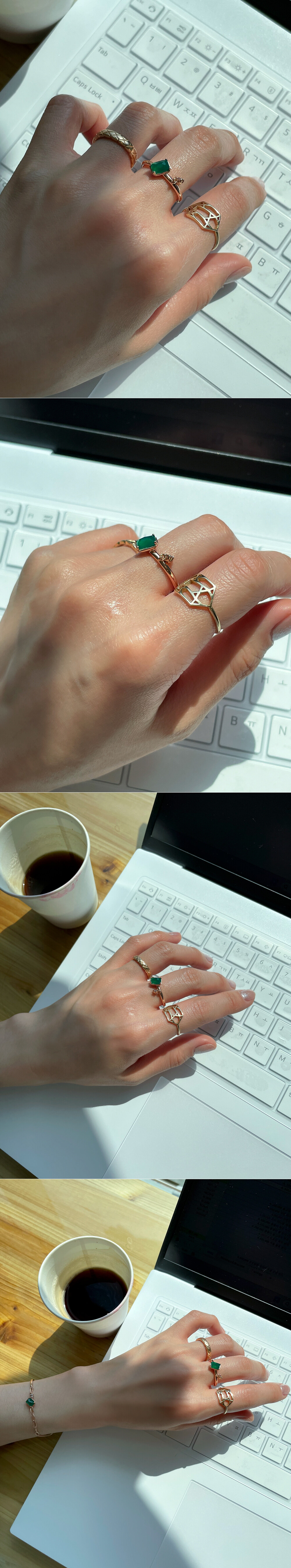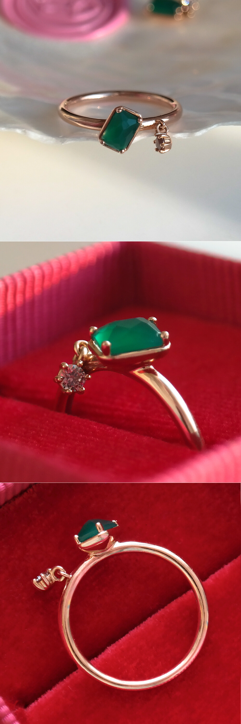 심플하면서 여성스러운 디자인의 그린 오닉스 반지입니다. 💍 차분한 느낌을 주는 딥 그린 컬러의 에메랄드컷 그린 오닉스가 메인 스톤으로 세팅되었구요, 스톤 쉐입이 사각 로즈컷 형태라 단조로우면서도 엣지있고 세련된 느낌이 있습니다. 딸랑이 부분은 큐빅이구요, 코냑 컬러의 큐빅이 함께 조화를 이루었어요. 💚 어떤 코디에도 잘 어울리는 그린 톤이라 데일리 반지로 활용하셔도 좋을 것 같아요. 멋스러운 느낌의 포인트 및 레이어드 반지로 추천해 드릴게요! 😃🩷