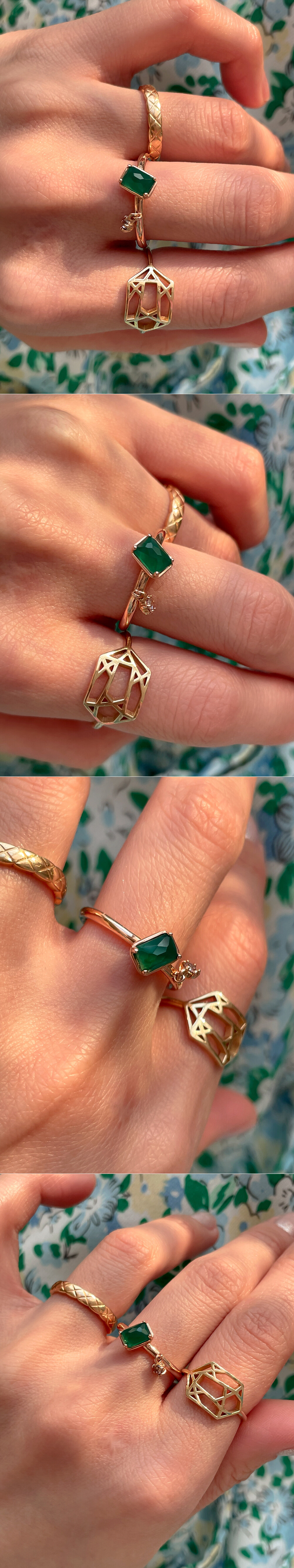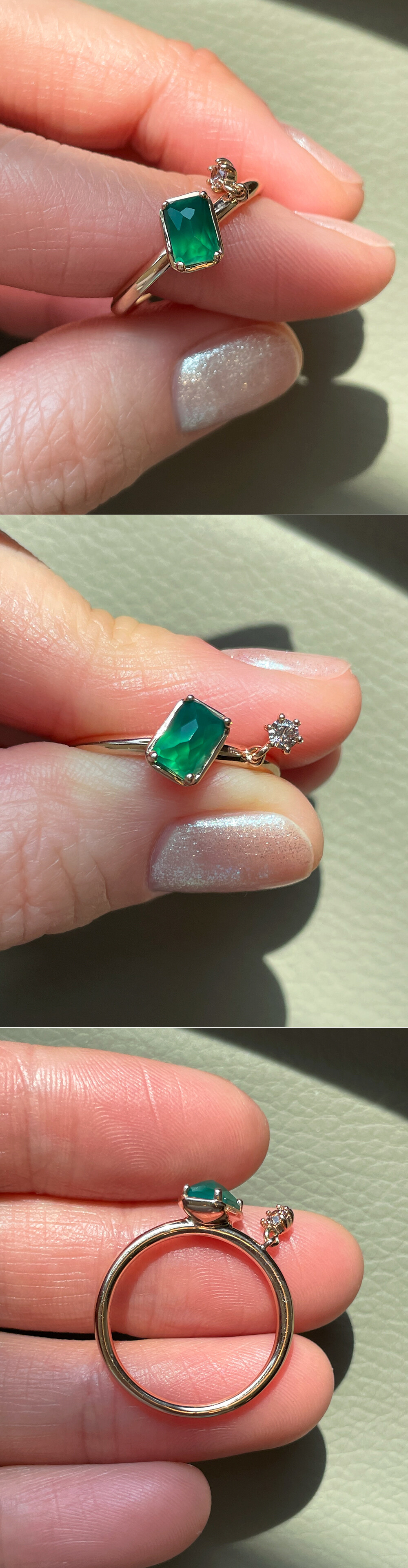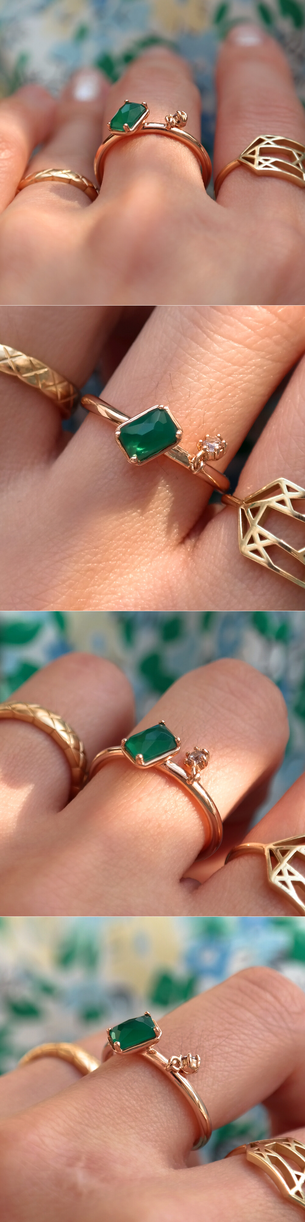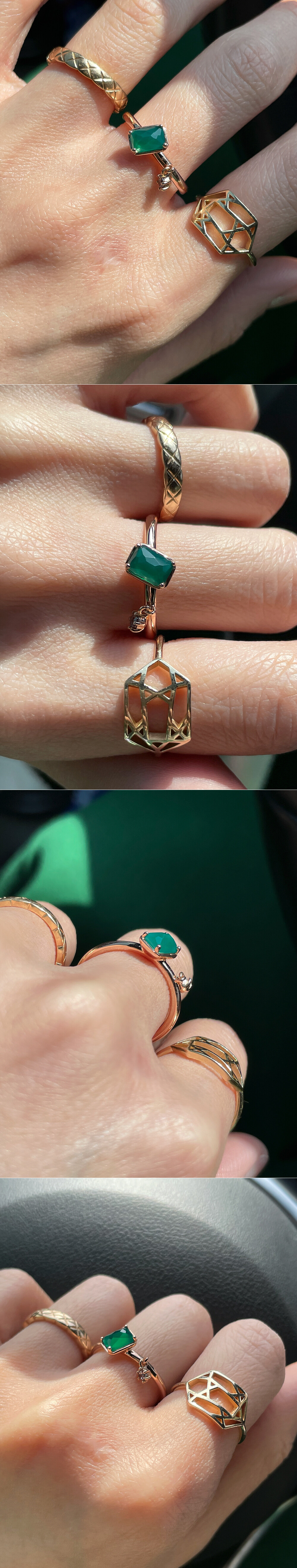 심플하면서 여성스러운 디자인의 그린 오닉스 반지입니다. 💍 차분한 느낌을 주는 딥 그린 컬러의 에메랄드컷 그린 오닉스가 메인 스톤으로 세팅되었구요, 스톤 쉐입이 사각 로즈컷 형태라 단조로우면서도 엣지있고 세련된 느낌이 있습니다. 딸랑이 부분은 큐빅이구요, 코냑 컬러의 큐빅이 함께 조화를 이루었어요. 💚 어떤 코디에도 잘 어울리는 그린 톤이라 데일리 반지로 활용하셔도 좋을 것 같아요. 멋스러운 느낌의 포인트 및 레이어드 반지로 추천해 드릴게요! 😃🩷