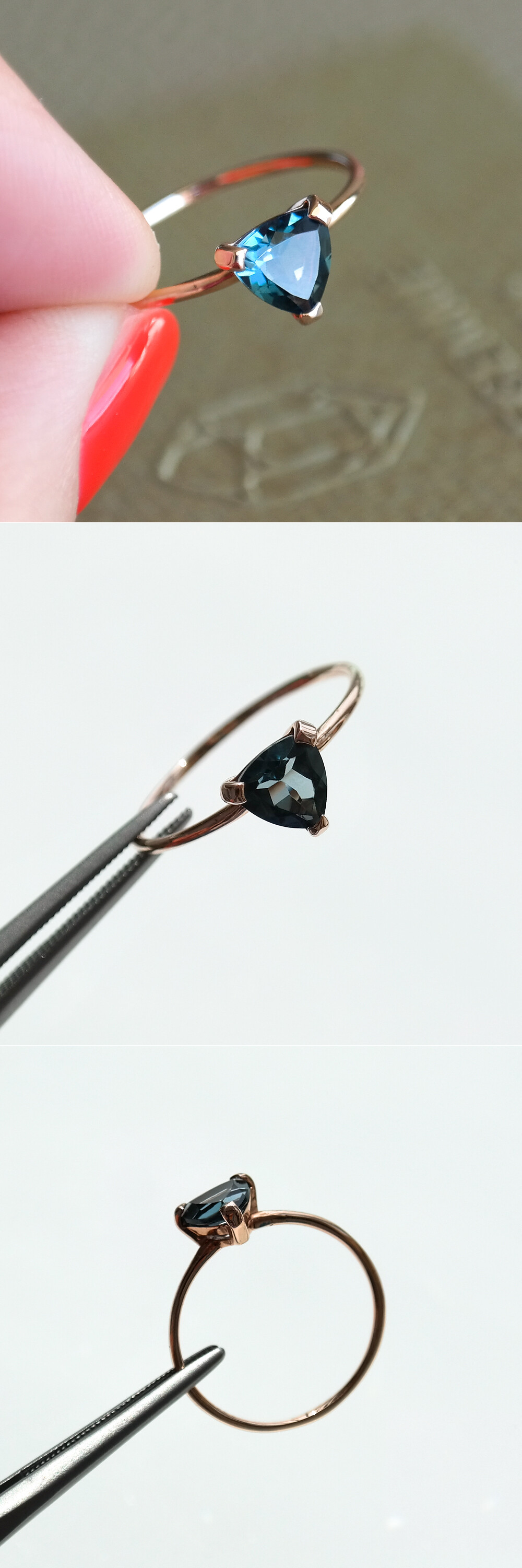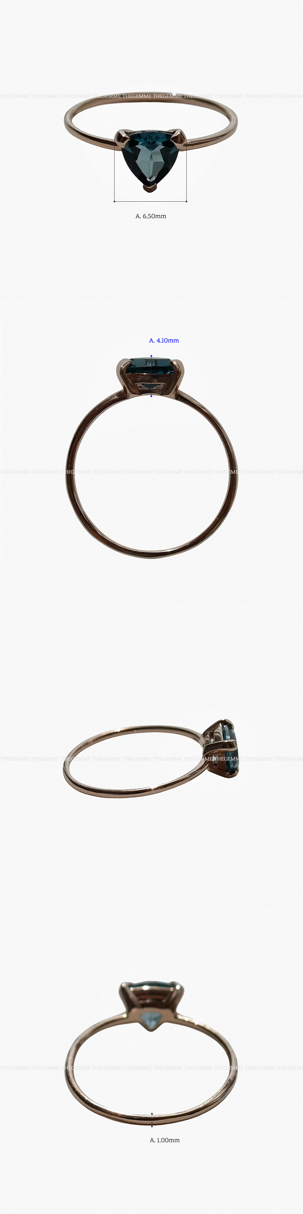 세련된 트릴리언컷의 런던블루 토파즈가 세팅된 스톤 반지입니다. 11월의 탄생석인 런던블루 토파즈는 보통의 블루 토파즈보다 색이 더 깊고 진한 다크 - 블루 색상을 나타내는 토파즈의 명칭이에요. 아마 보석을 좋아하시는 분들이라면 많이들 알고 계실텐데요, 이 스톤은 매혹적이면서도 고급스러운 인상을 주는 보석으로 이미 많이 알려져 있어 한국에서 가장 인기 있는 보석 중에 하나이기도 하답니다. 세팅된 런던블루 토파즈는 약 6mm 지름의 스톤입니다. 얇은 파이프 밴딩에 깔끔한 프롱 세팅으로 올려놓은 디자인이라 데일리 스톤 반지로 활용하시기 좋아요. 페이지에서 주문 시 이미지에 세팅된 같은 런던블루 토파즈로 세팅되니 참고해 주시구요, 스톤은 다른 종류의 탄생석 스톤으로도 세팅 가능합니다. (스톤 변경 세팅을 원하시는 분들은 네이버 톡톡 문의 주세요.) 💙