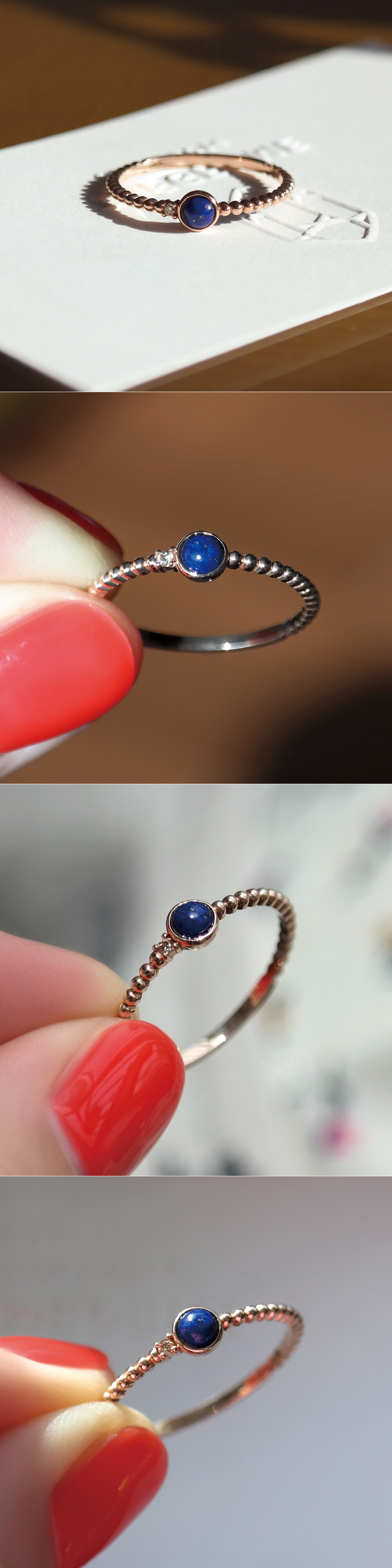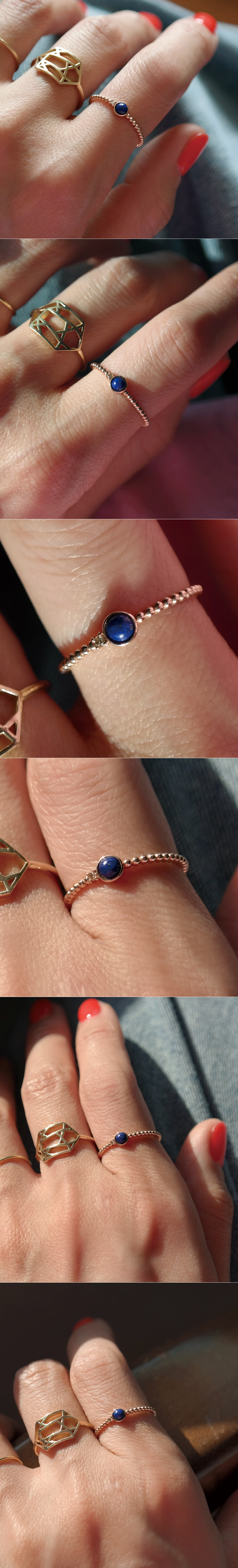 지름 약 3mm 사이즈의 래피스래줄라이 캐보션과 멜리 사이즈의 코냑 다이아몬드가 함께 세팅된 스톤 반지입니다. 싱글 언발 디자인이구요, 돔 형태의 캐보션 스톤과 버블 볼 디자인의 밴드로 동글동글한 느낌들이 어우러져 귀여운 인상을 준답니다 :) 군더더기 없이 깔끔한 스타일이라 데일리 반지로 추천해 드릴게요. 💙