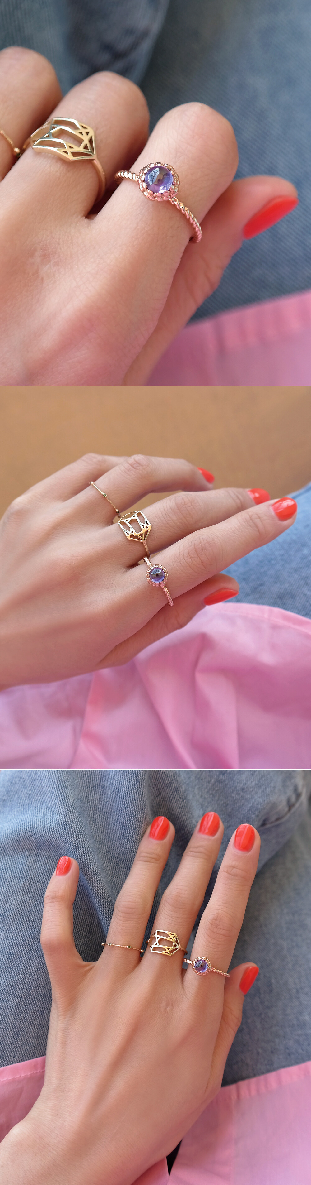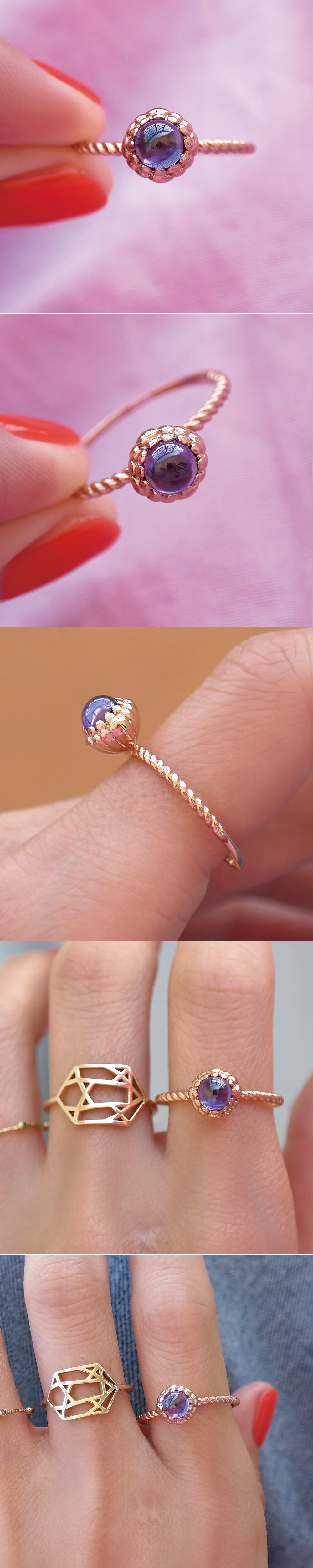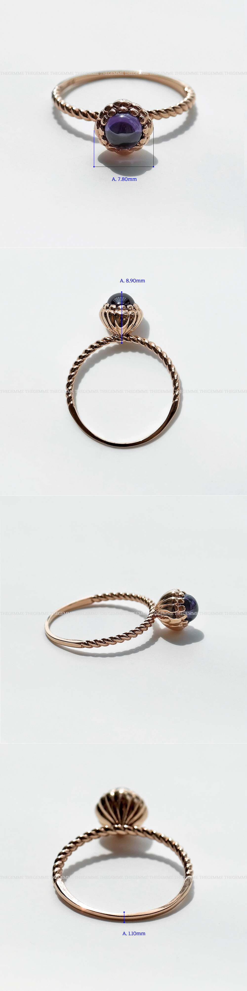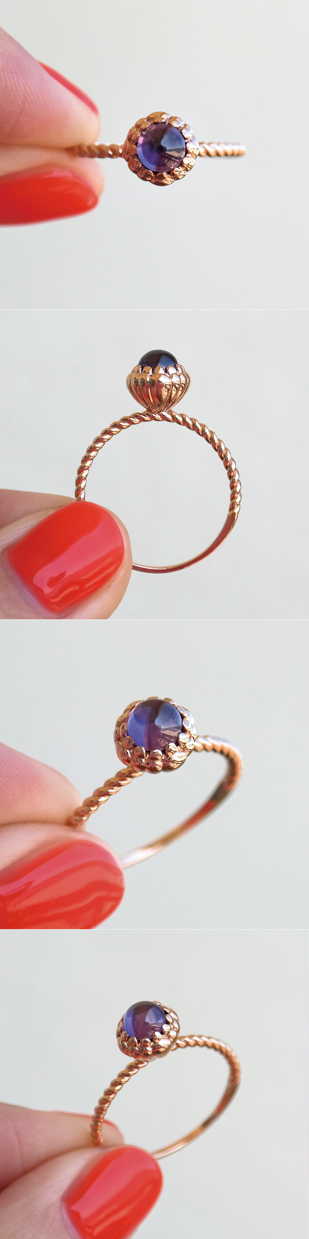 귀여운 캐보션 쉐입의 자수정이 세팅된 스톤 반지입니다. 얇은 꼬임 밴드에 봉긋한 메인 스톤 장식이 눈에 들어오는 마카롱 스타일의 반지랍니다. 여성스럽고 귀여운 매력으로 데일리로 착용하실 포인트 반지를 찾으시는 분들께 추천해 드릴게요. 💜
