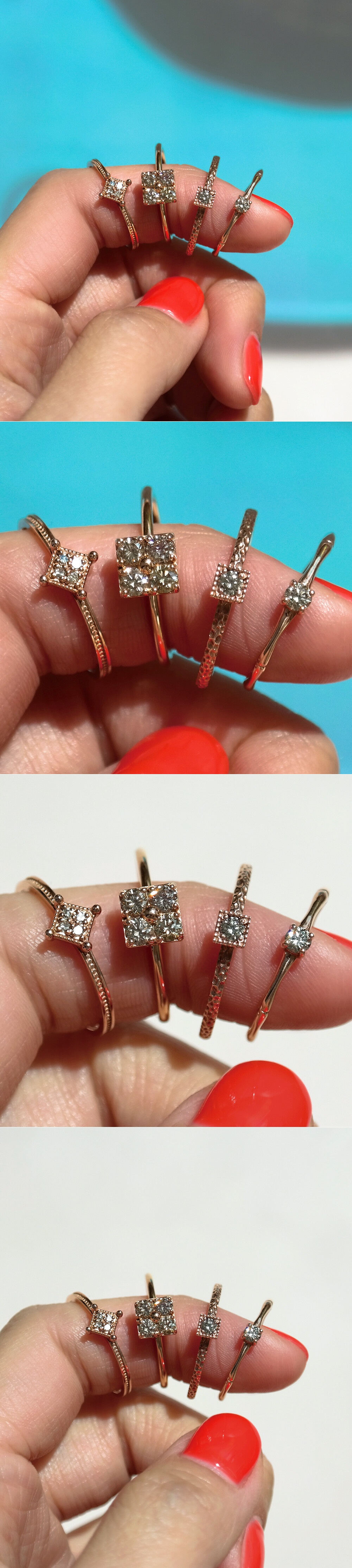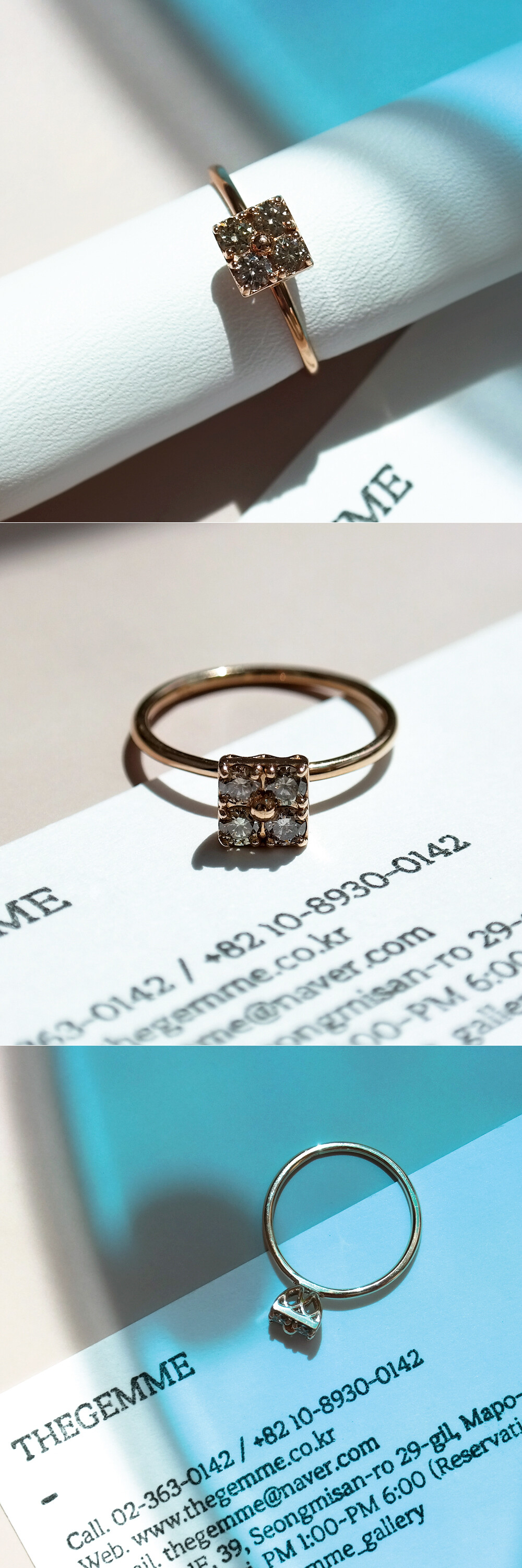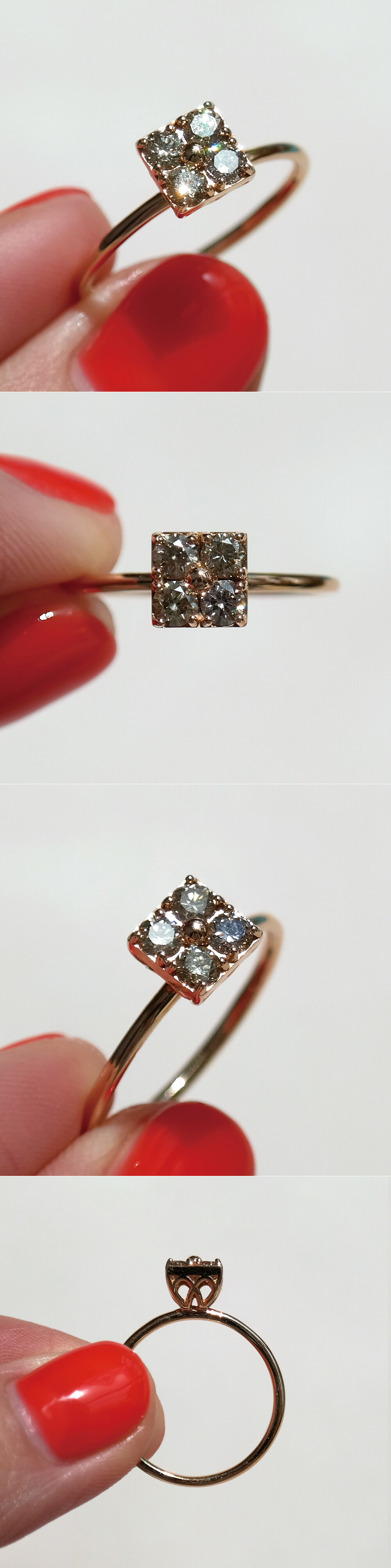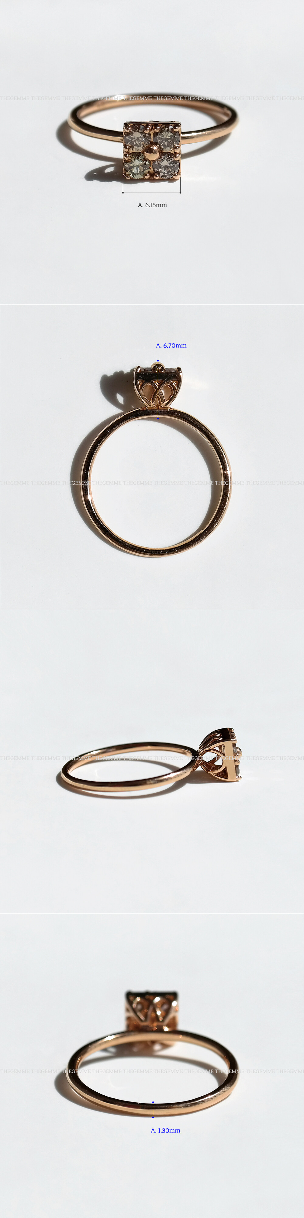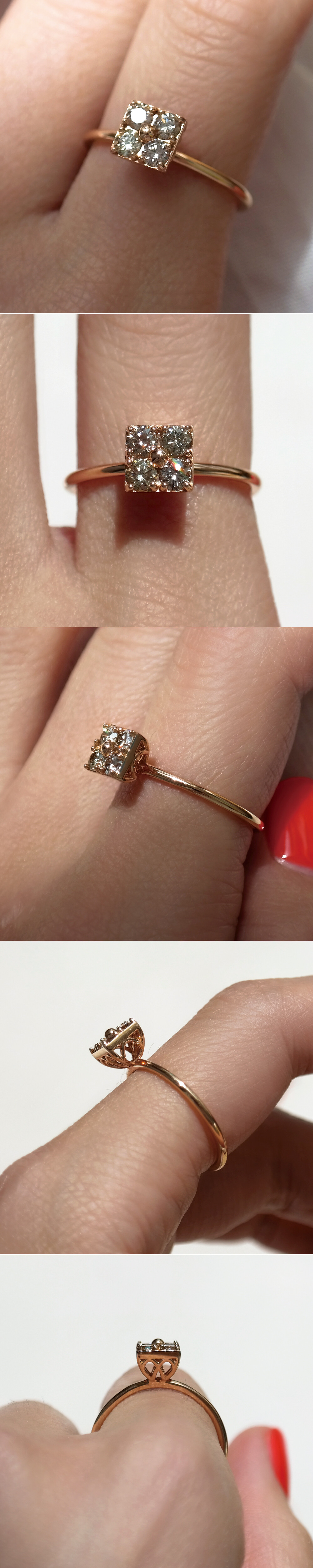 세련된 사각 쉐입을 가진 코냑 다이아몬드 반지입니다. 세팅된 다이아몬드는 약 1부 사이즈의 코냑 다이아몬드로 총 4P가 세팅되어 있어요. 차분해 보이는 브론즈 계열의 색감을 가진 천연 다이아몬드로 고급스러운 이미지를 연출하시기에 좋답니다. 미니멀한 디자인으로 가드링과 함께 끼워주면 더욱 더 멋진 스타일링이 가능해요. 봉긋하게 올라오는 프롱 디자인으로 포인트 반지로 및 레이어드 반지로도 최고! 여성스럽고 세련된 느낌의 고급스러운 다이아몬드 반지를 찾으시는 분들께 추천해 드릴게요. ❤️
