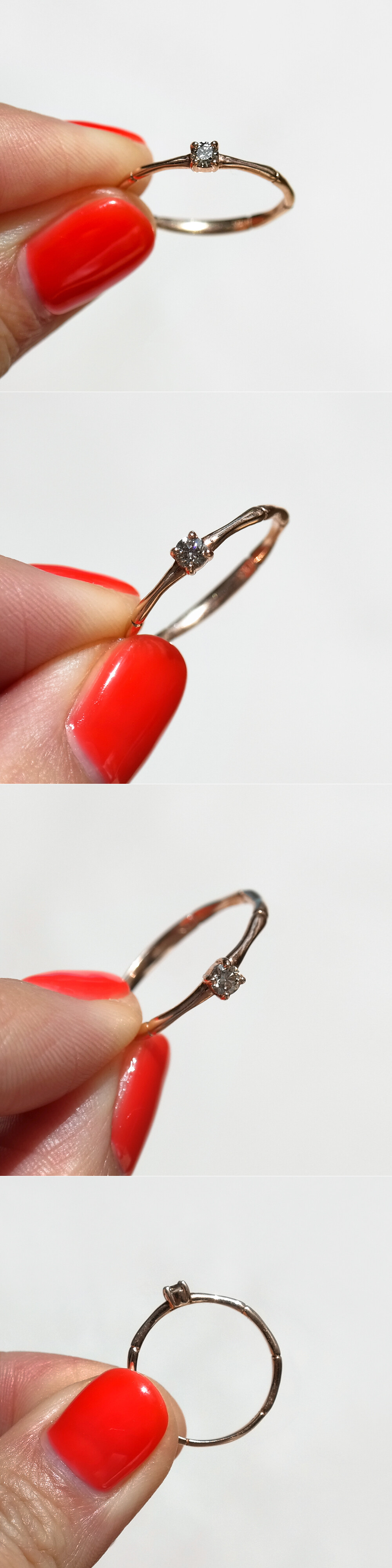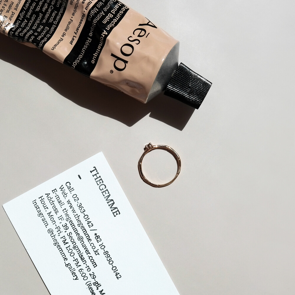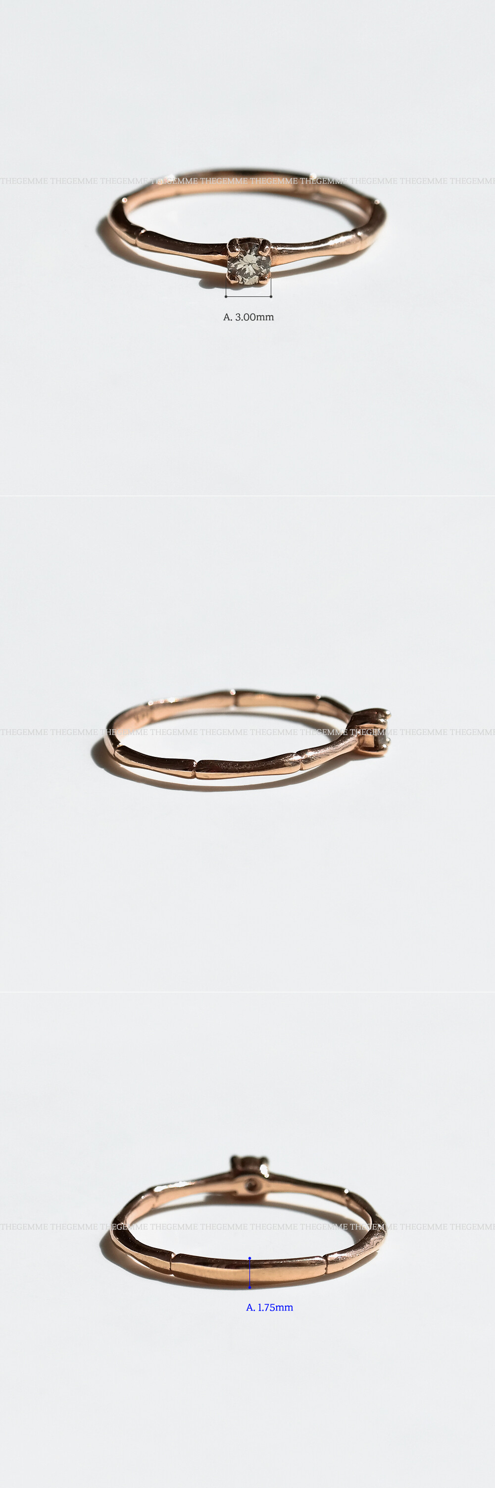 차분해 보이는 브론즈 계열의 색감을 가진 천연 코냑 다이아몬드가 세팅된 반지입니다. 다이아몬드 지름 약 3mm 사이즈구요, 깔끔한 네발 프롱 디자인으로 세팅되어 착용감이 좋습니다. 여리여리한 느낌을 가진 우드 디자인 밴드와 함께 매칭되어 여성스러운 느낌이에요. 데일리 반지로 추천해 드릴게요. ❤️