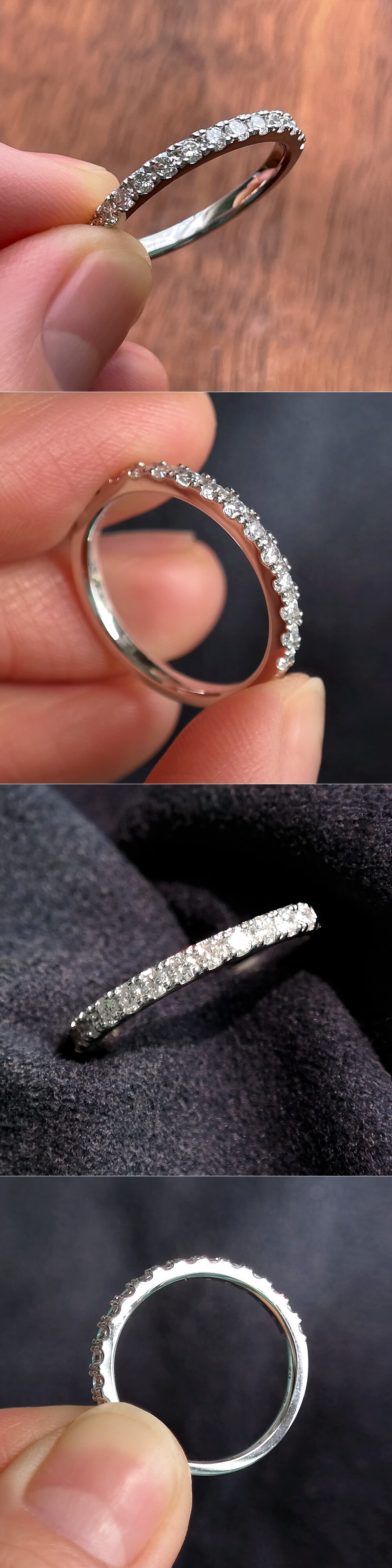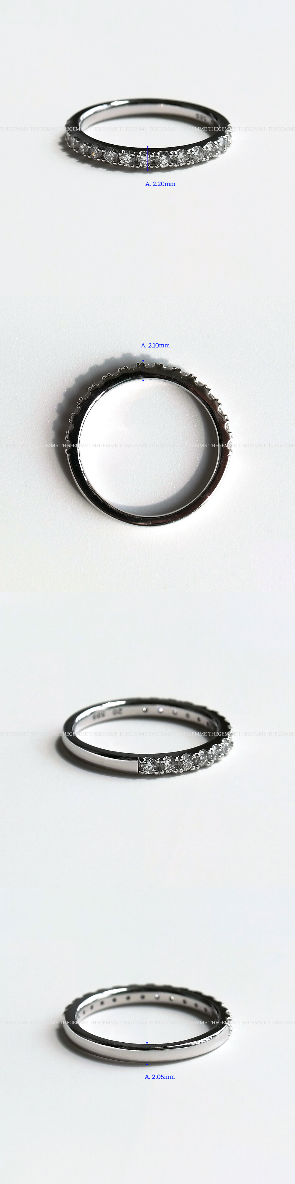 영롱한 브릴리언스를 뽐내는 랩 그로운 (합성) 다이아몬드가 세팅된 이터니티 반지입니다. 기본 네발 프롱 디자인으로 가장 클래식한 라인의 반지라 여러모로 활용도가 높은 아이랍니다. 세팅되는 스톤의 mm 지름에 따라서 사이즈별로 나뉘구요, 2mm, 2.25mm, 2.75mm, 3.25mm, 3.5mm, 3.75mm 로 총 6가지 사이즈가 있습니다. 미세한 크기 차이지만 각각 비교해 보시라고 모두 함께 촬영한 사진을 첨부해두었으니 자세한 크기 차이는 영상과 이미지를 참고해 주세요. 그리고 랩 그로운 다이아몬드의 경우에도 천연 다이아몬드와 마찬가지로 ⓐ 감정원의 감정서가 있는 다이아몬드와 ⓑ 감정서가 없는 모노 다이아몬드로 나뉘는데요, 요 아이들은 모노 다이아몬드들입니다. 감정서가 없는 모노 다이아몬드는 보통, 환금성을 전혀 기대하지 않으시는 분들과 합리적인 가격을 더 중요하게 생각하시는 분들에게 인기가 많아요. 그 이유는 감정서가 있는 다이아몬드는 모노 다이아몬드보다 상대적으로 가격이 높기 때문인데요. * 감정원 (회사) 마다 차이가 있지만 다이아몬드에 감정서 비용 등이 포함되어 있어요. 비슷한 이유들로 다이아몬드 반지 구매를 고민하시는 분들께 요 아이들을 소개해 드리려고 해요. 참고로 보통 랩 그로운 다이아몬드의 클래리티 등급은 못해도 SI1~VS2 이상 나온다고 보시면 된답니다. [ 평균적으로 컷팅은 VG / 컬러는 F 이상의 등급 ] * 모노 다이아몬드라고 해서 퀄리티가 떨어지는 것이 아니에요. 다만, 랩 그로운 다이아몬드에도 등급이 있는데 (최상 / 상 / 중 / 하) 요 아이들은 최상 등급의 모노 다이아몬드로 세팅되는 아이들입니다. 요 부분 참고해 주시구요, 깔끔한 네발 프롱 디자인으로 메인 반지와 함께 착용하실 가드링이나 데일리 반지를 찾으시는 분들께 추천해 드릴게요. 스톤의 경우 ; 천연 다이아몬드로 변경도 가능하시구요, 기타 스톤 (큐빅, 탄생석 등) 으로도 변경 가능하시니 스톤 변경을 원하시는 분들은 네이버 톡톡으로 문의 주세요. ❤️