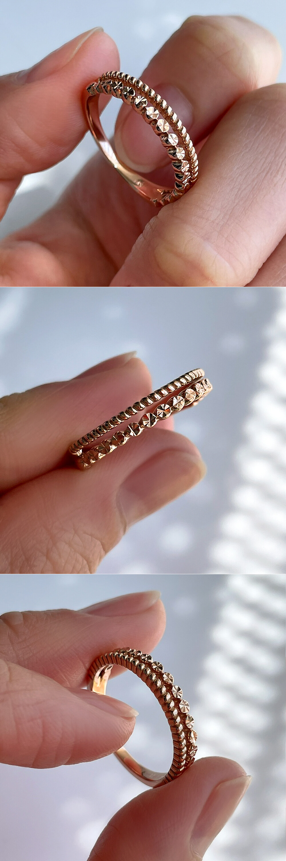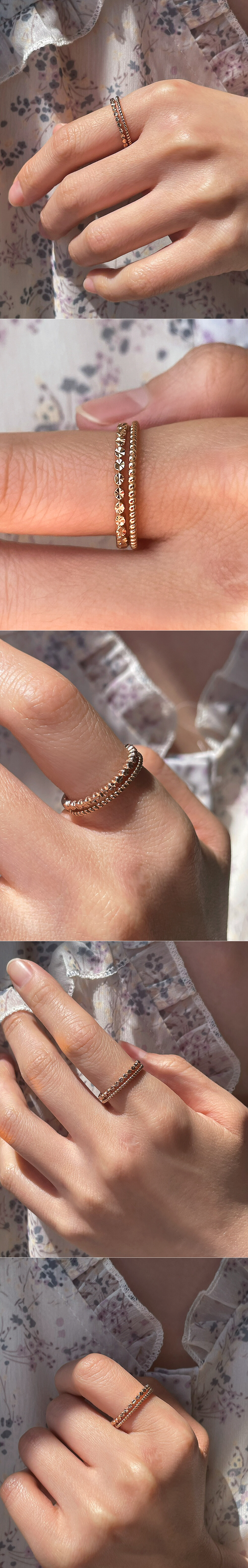 언발란스한 라인의 두줄 반지입니다. 컷팅된 면이 있어서 움직일 때마다 반짝이는 매력이 있어요. 편안한 착용감으로 데일리용 포인트 반지를 찾으시는 분들께 추천해 드릴게요 :)
