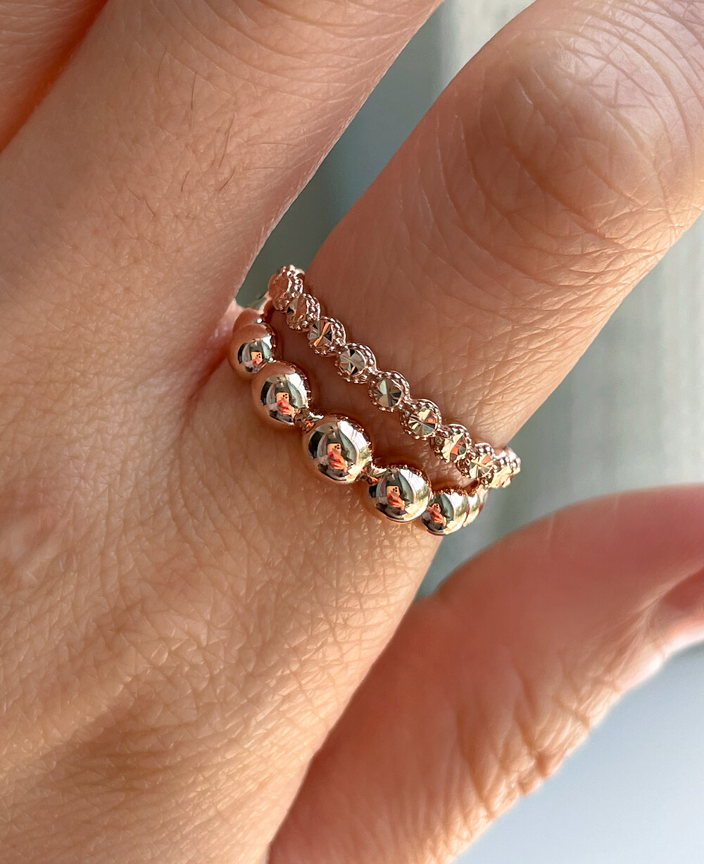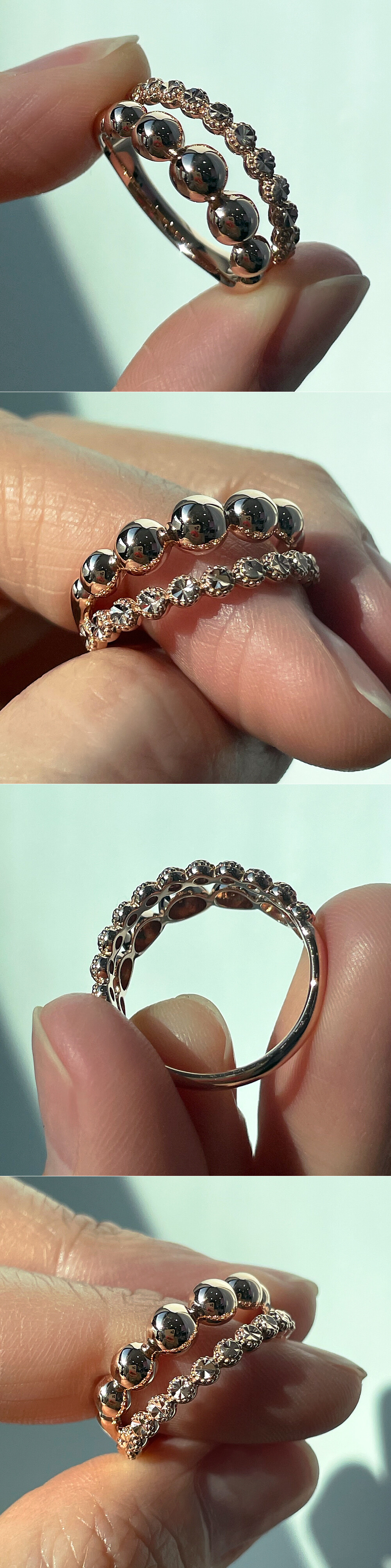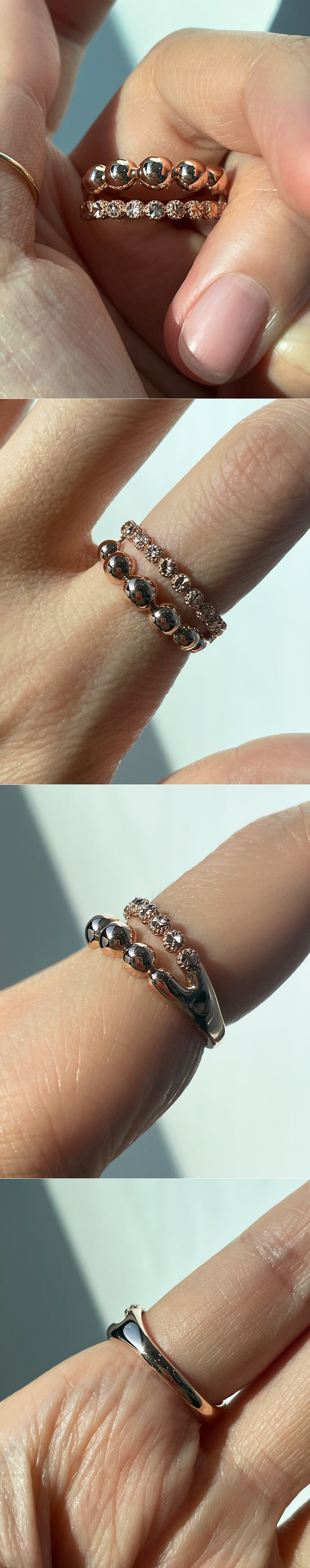 언발란스한 라인의 두줄 반지입니다. 컷팅된 면이 있어서 움직일 때마다 반짝이는 매력이 있어요. 볼드한 중량감과 편안한 착용감으로 데일리용 포인트 반지를 찾으시는 분들께 추천해 드릴게요! 🩷