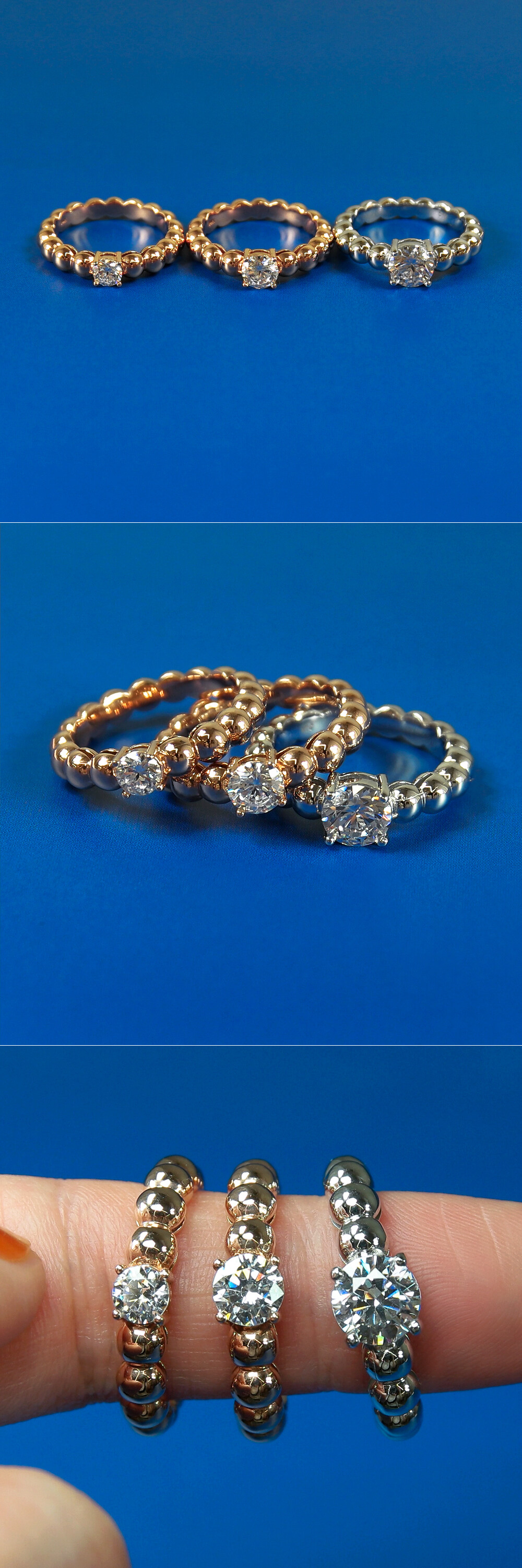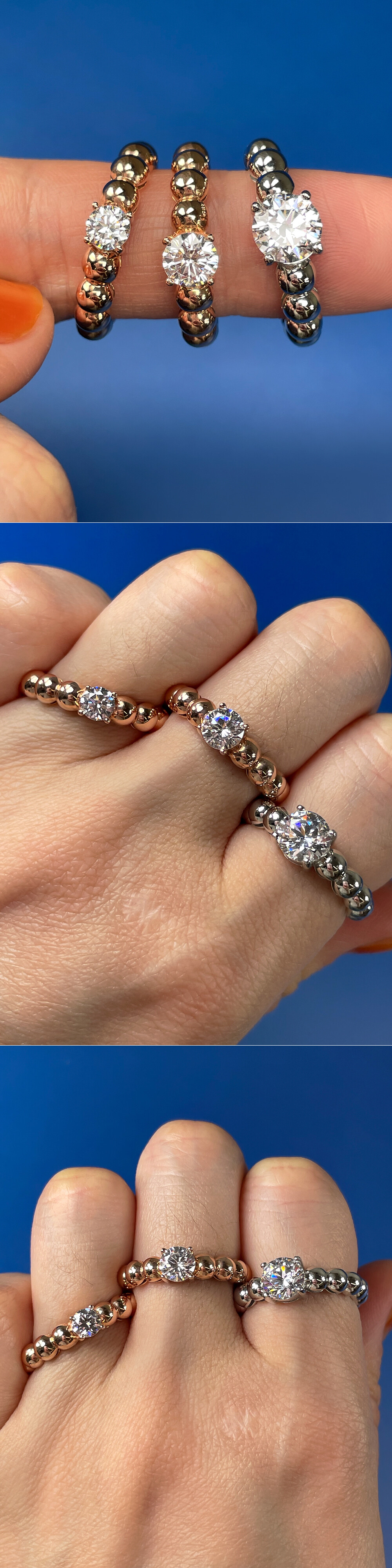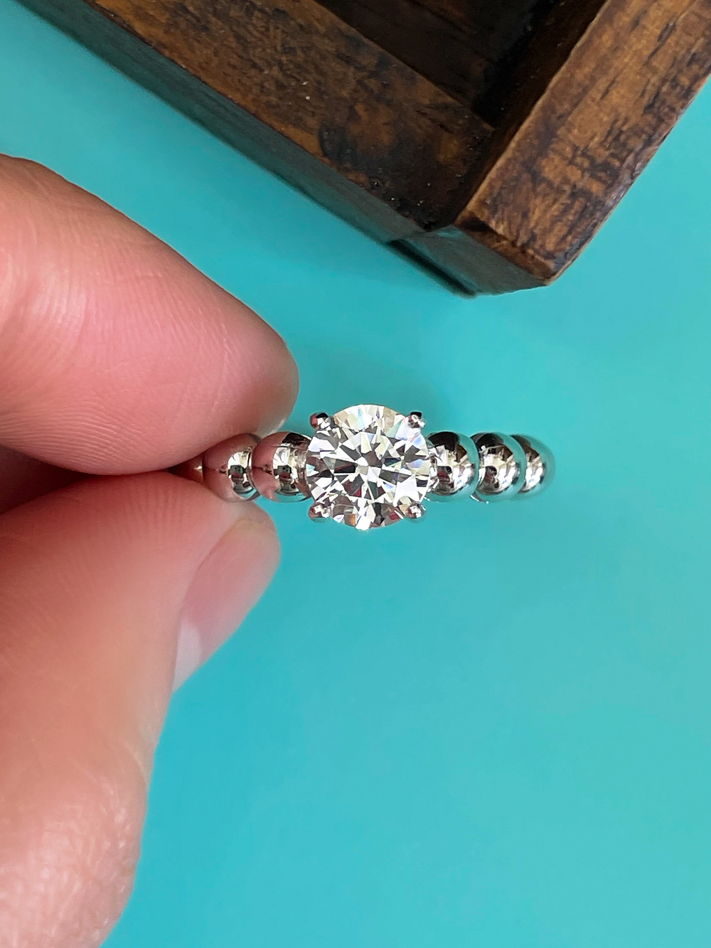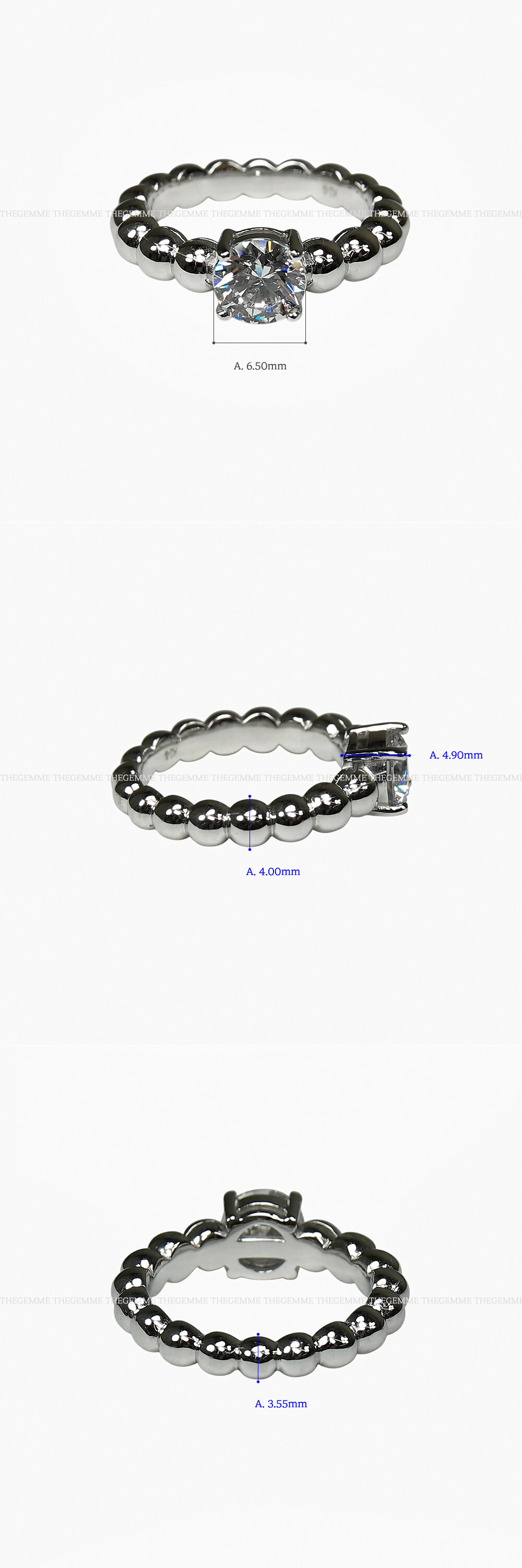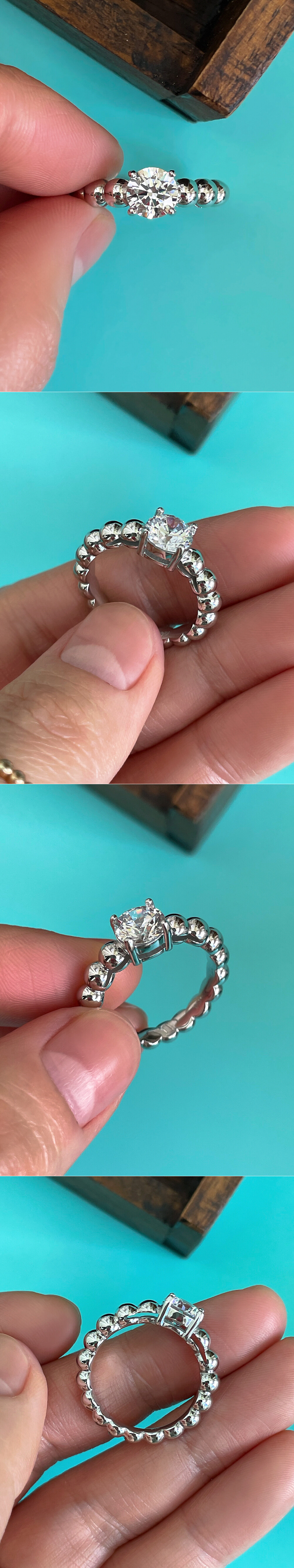입체적인 버블 볼 밴드 위에 라운드 컷 스톤을 세팅한 볼륨감 있는 디자인의 반지입니다. 단단한 4프롱 세팅으로 안정감이 있으며, 클래식한 디자인으로 유행을 타지 않아 오래도록 착용할 수 있습니다.