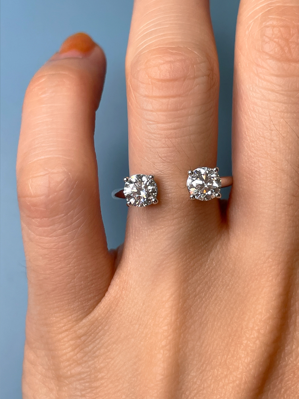 심플하면서도 흔하지 않은 투 스톤 솔리테어 디자인으로 어떤 룩에도 잘 어울리며, 다른 반지와 함께 레이어드하여 더욱 화려하게 연출하실 수 있습니다.