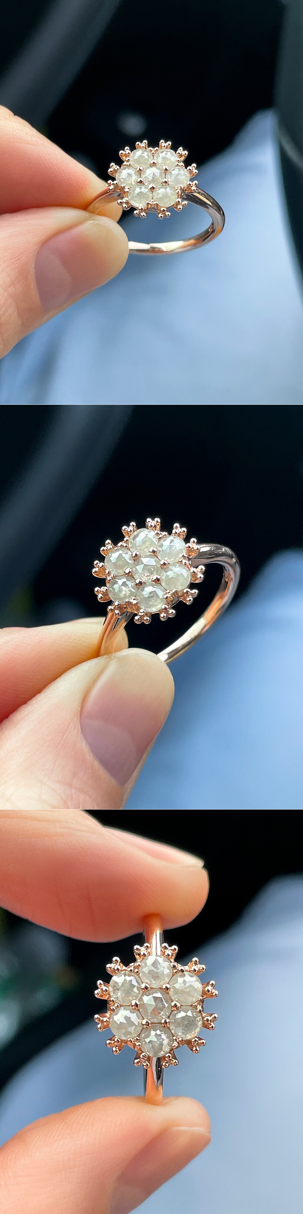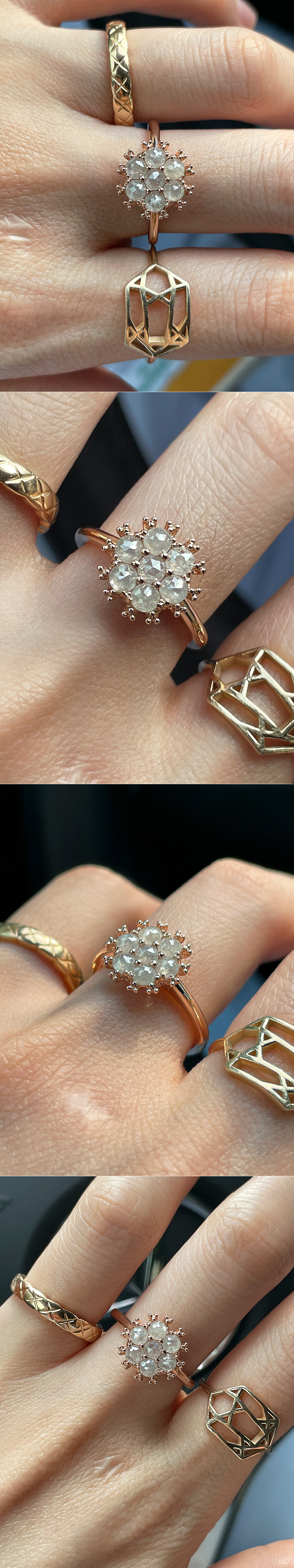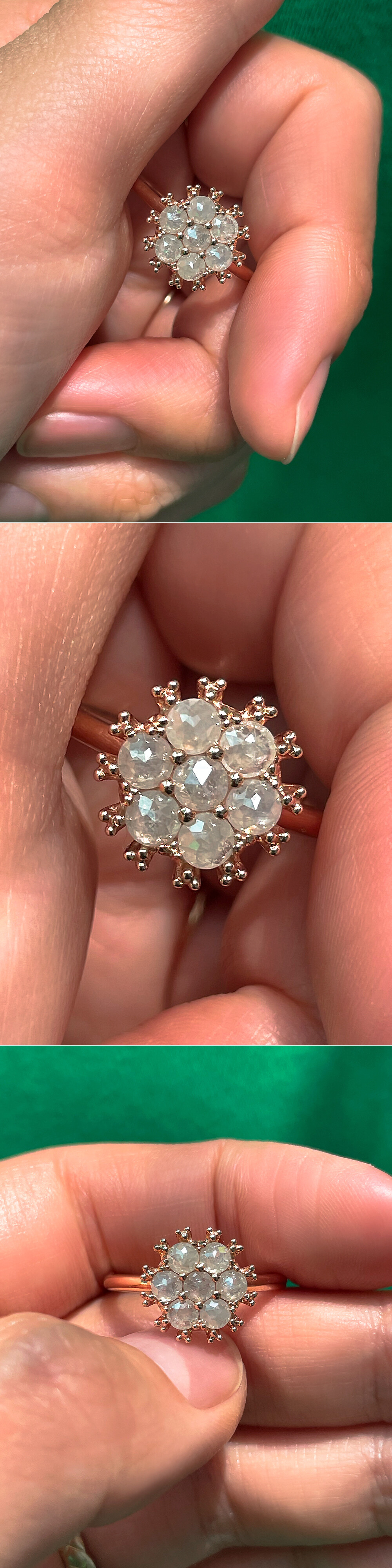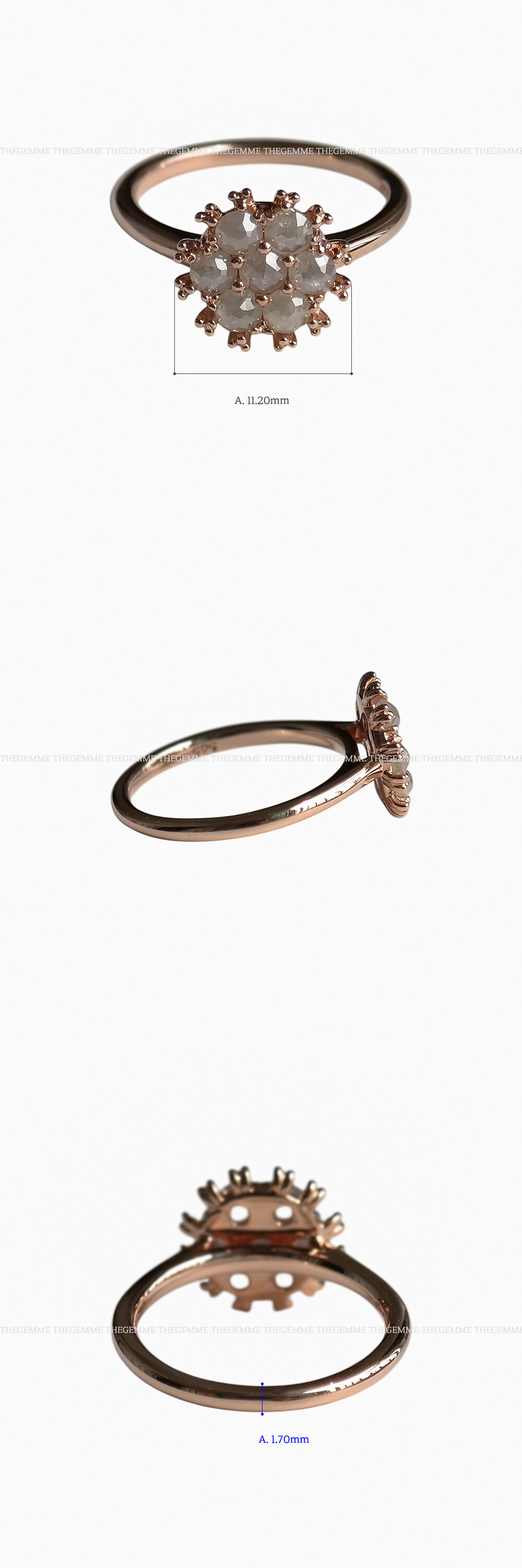 가공되지 않은 자연의 아름다움을 담은 그레이 러프 다이아몬드를 꽃처럼 섬세하게 세팅한 디자인의 반지입니다. 각각의 스톤이 지닌 고유한 빛과 결이 어우러져 인위적이지 않은 깊이 있는 광채를 만들어내며, 차분하면서도 감각적인 분위기를 완성합니다. 작은 꽃이 피어난 듯한 클러스터 형태는 손끝에 은은한 포인트를 더해주고, 데일리부터 특별한 날까지 자연스럽게 어우러집니다. 화려함보다는 ‘분위기’로 완성되는 주얼리, 시간이 지날수록 더욱 매력적인 러프 다이아몬드의 가치를 담은 아이템입니다. 나만의 감성을 담을 수 있는 자연스러운 광채의 주얼리를 선호하시는 분들께 추천해 드립니다 :)