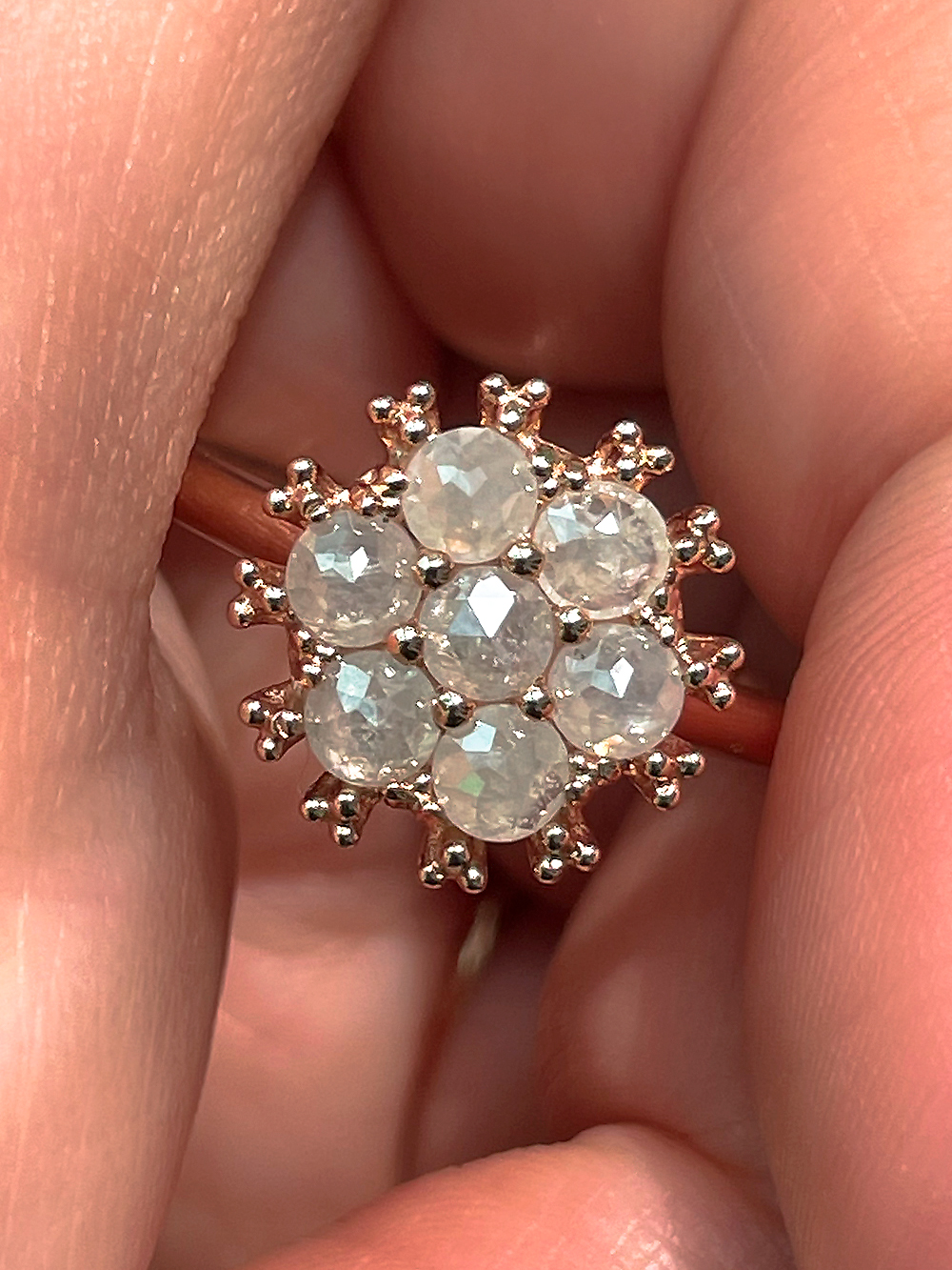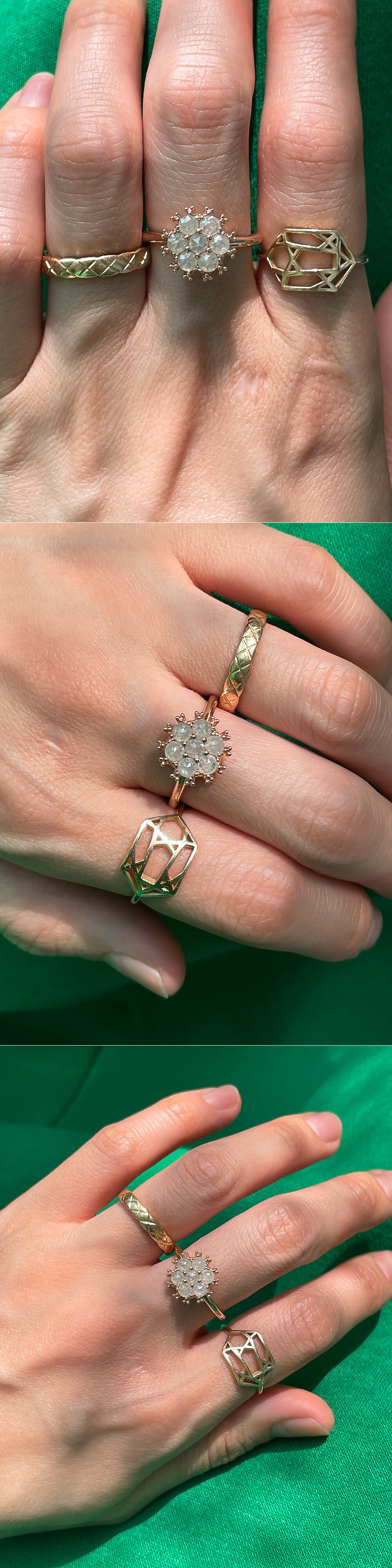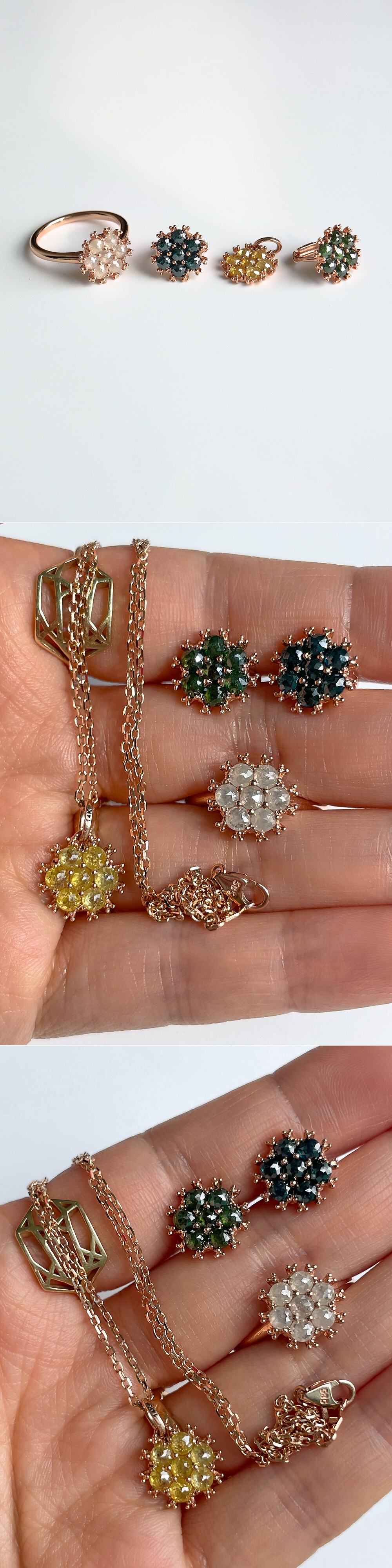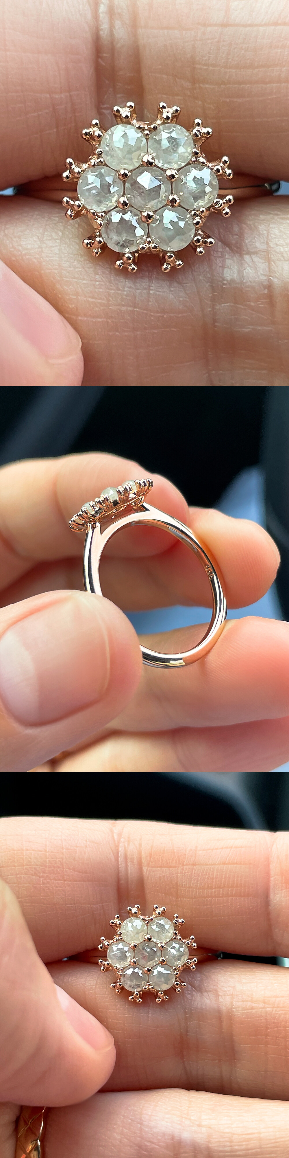 가공되지 않은 자연의 아름다움을 담은 그레이 러프 다이아몬드를 꽃처럼 섬세하게 세팅한 디자인의 반지입니다. 각각의 스톤이 지닌 고유한 빛과 결이 어우러져 인위적이지 않은 깊이 있는 광채를 만들어내며, 차분하면서도 감각적인 분위기를 완성합니다. 작은 꽃이 피어난 듯한 클러스터 형태는 손끝에 은은한 포인트를 더해주고, 데일리부터 특별한 날까지 자연스럽게 어우러집니다. 화려함보다는 ‘분위기’로 완성되는 주얼리, 시간이 지날수록 더욱 매력적인 러프 다이아몬드의 가치를 담은 아이템입니다. 나만의 감성을 담을 수 있는 자연스러운 광채의 주얼리를 선호하시는 분들께 추천해 드립니다 :)