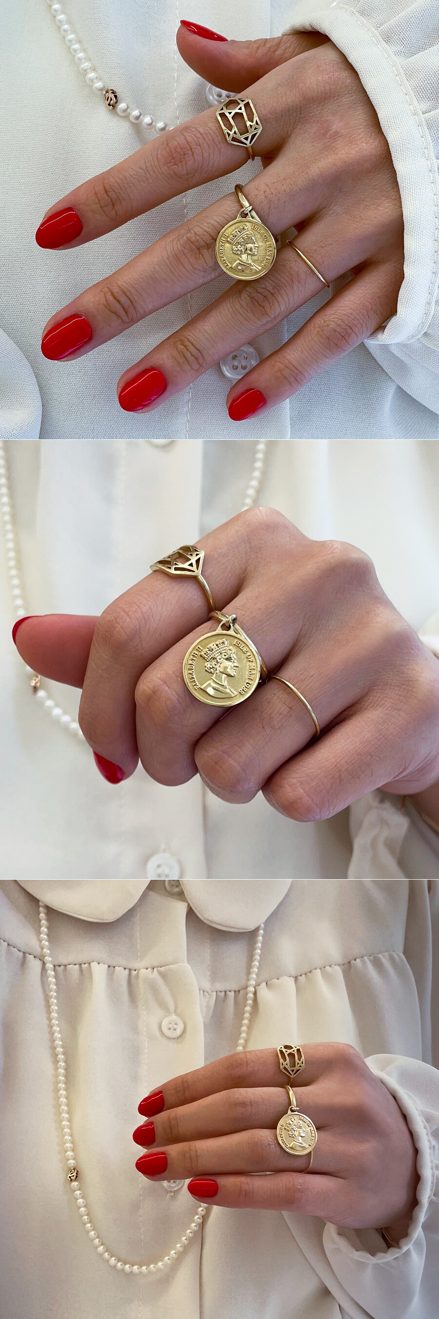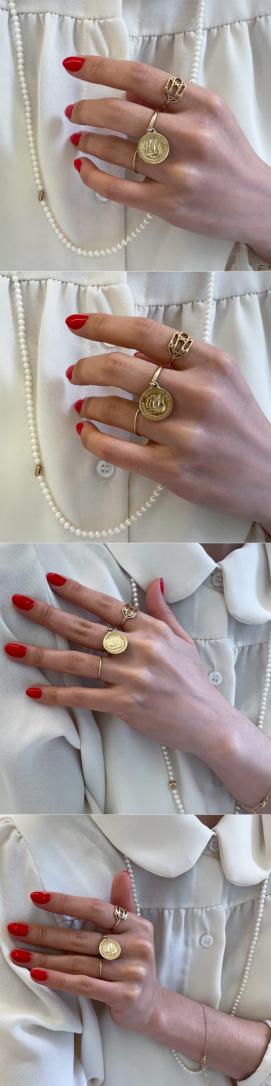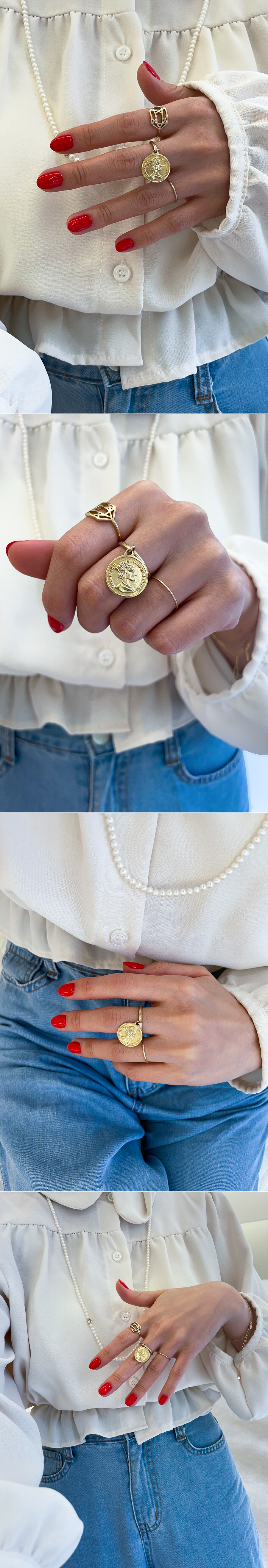 볼드한 중량감의 존재감 확실한 아이, ! 엘리자베스 여왕 양각이 새겨진 주화 모티브의 코인 반지입니다. (양면이 각각 다른 양각으로 새겨져 있으니 상세 이미지를 참고해 주세요.) 손가락을 움직일 때마다 딸랑이 코인이 안정감 있는 형태로 움직여요. 비교적 큰 사이즈의 코인으로 중량감이 있어서 타이트한 정 사이즈로 주문해 주시는 것이 좋습니다. 블링블링한 느낌의 캐주얼 반지로 추천해 드릴게요 :) 💙