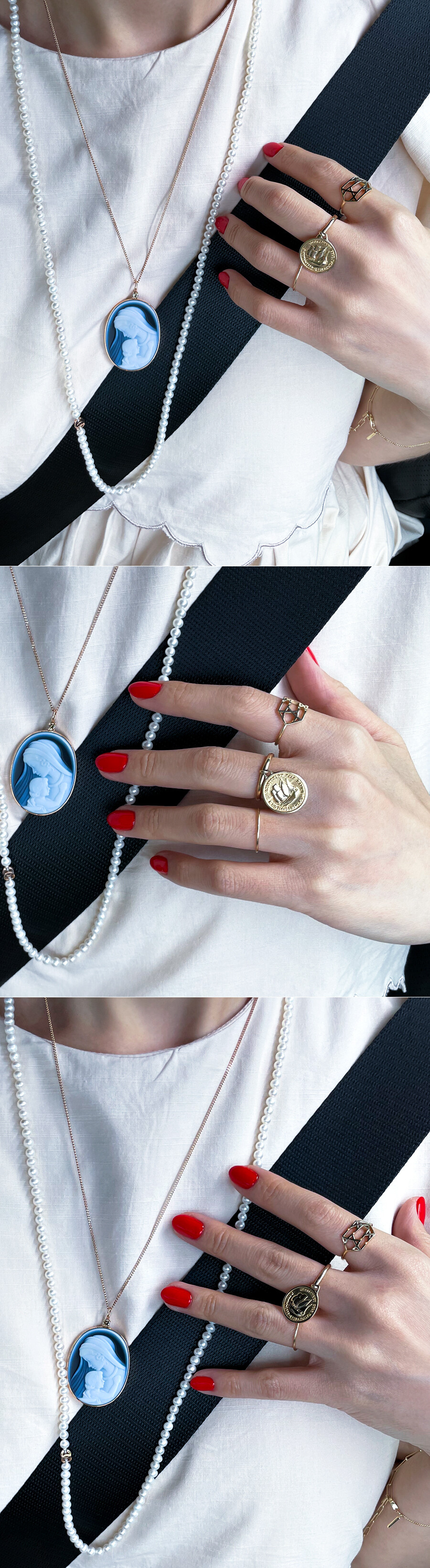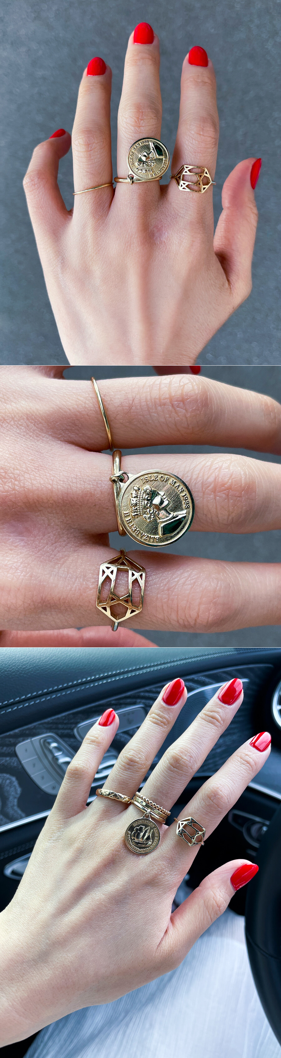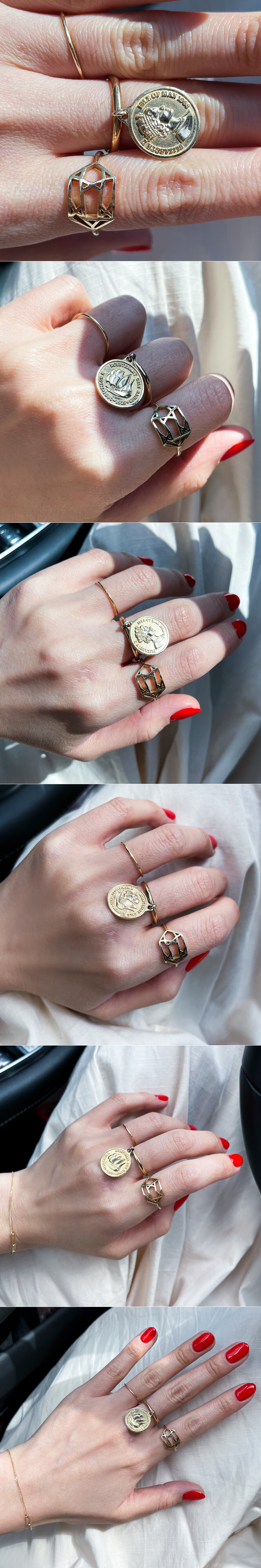 볼드한 중량감의 존재감 확실한 아이, ! 엘리자베스 여왕 양각이 새겨진 주화 모티브의 코인 반지입니다. (양면이 각각 다른 양각으로 새겨져 있으니 상세 이미지를 참고해 주세요.) 손가락을 움직일 때마다 딸랑이 코인이 안정감 있는 형태로 움직여요. 비교적 큰 사이즈의 코인으로 중량감이 있어서 타이트한 정 사이즈로 주문해 주시는 것이 좋습니다. 블링블링한 느낌의 캐주얼 반지로 추천해 드릴게요 :) 💙